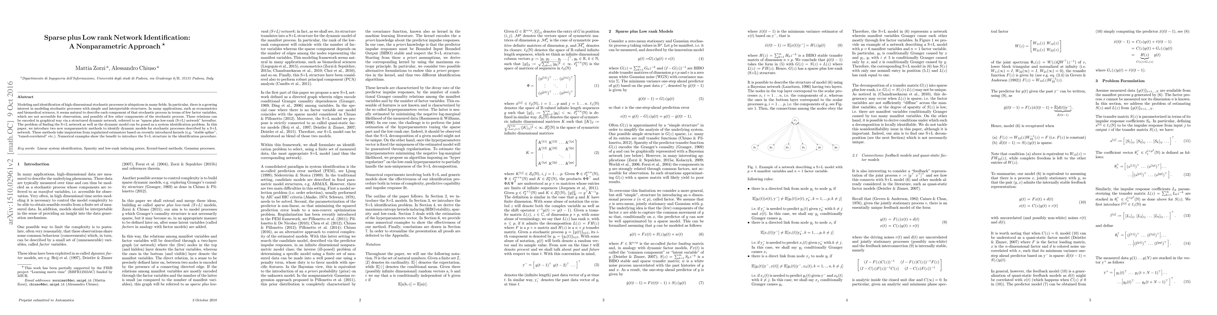 This paper proposes two nonparametric methods for identifying dynamic models of stochastic processes represented by sparse plus low-rank networks. These methods leverage regularized estimators and recently introduced kernels, demonstrating improved performance through numerical examples.