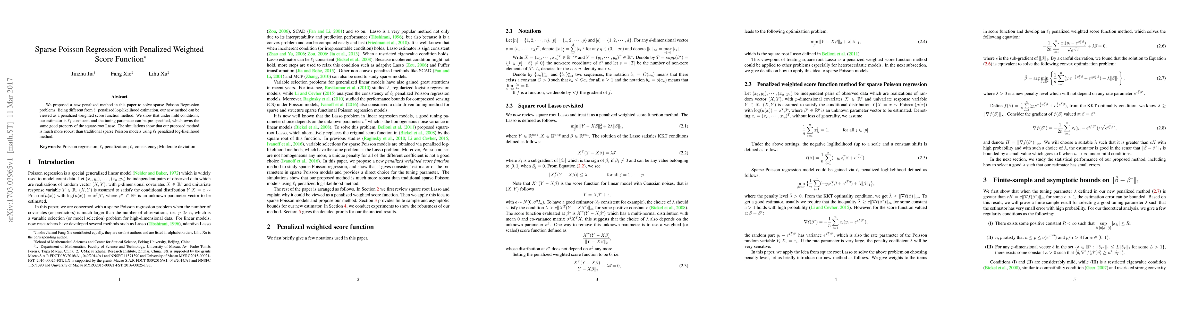 We proposed a new penalized method in this paper to solve sparse Poisson Regression problems. Being different from $\ell_1$ penalized log-likelihood estimation, our new method can be viewed as penalized weighted score function method. We show that under mild conditions, our estimator is $\ell_1$ consistent and the tuning parameter can be pre-specified, which shares the same good property of the square-root Lasso.