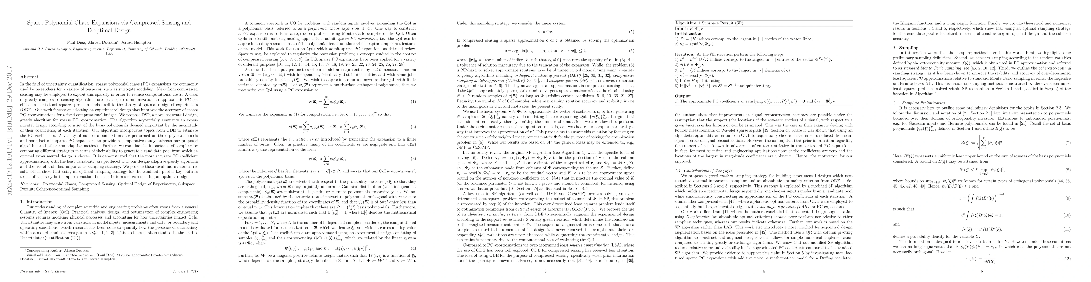 This paper proposes DSP, a novel sequential greedy algorithm for sparse polynomial chaos (PC) expansion, which leverages compressed sensing and D-optimal design to improve approximation accuracy within a fixed computational budget. Numerical simulations on physical models demonstrate that DSP, combined with an optimal sampling strategy, yields the most accurate PC coefficient approximations.