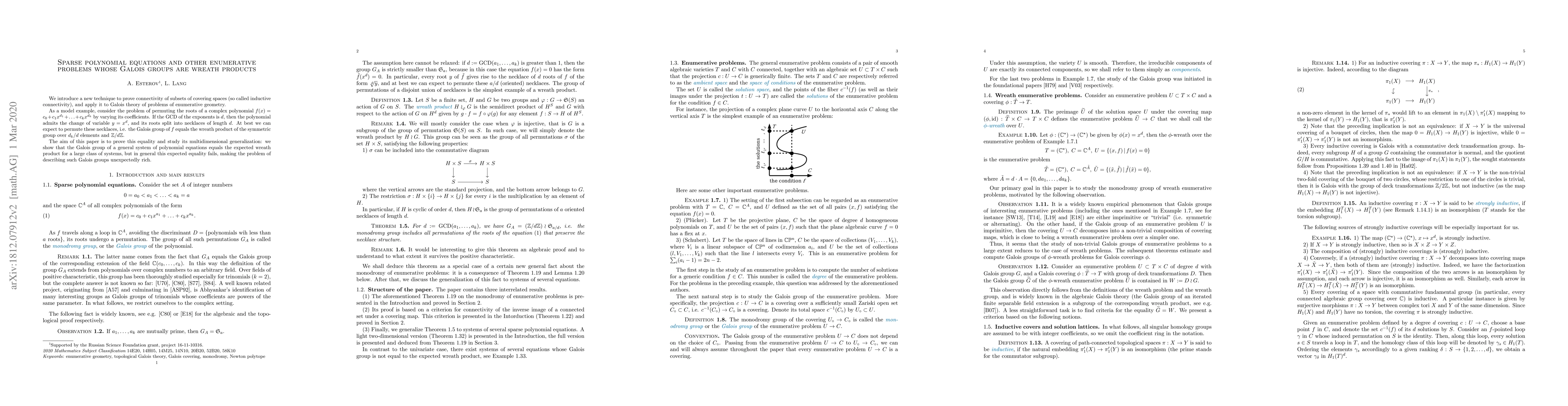 We introduce a new technique to prove connectivity of subsets of covering spaces (so called inductive connectivity), and apply it to Galois theory of problems of enumerative geometry. As a model example, consider the problem of permuting the roots of a complex polynomial $f(x) = c_0 + c_1 x^{d_1} + \ldots + c_k x^{d_k}$ by varying its coefficients. If the GCD of the exponents is $d$, then the polynomial admits the change of variable $y=x^d$, and its roots split into necklaces of length $d$. At best we can expect to permute these necklaces, i.e. the Galois group of $f$ equals the wreath product of the symmetric group over $d_k/d$ elements and $\mathbb{Z}/d\mathbb{Z}$. The aim of this paper is to prove this equality and study its multidimensional generalization: we show that the Galois group of a general system of polynomial equations equals the expected wreath product for a large class of systems, but in general this expected equality fails, making the problem of describing such Galois groups unexpectedly rich.