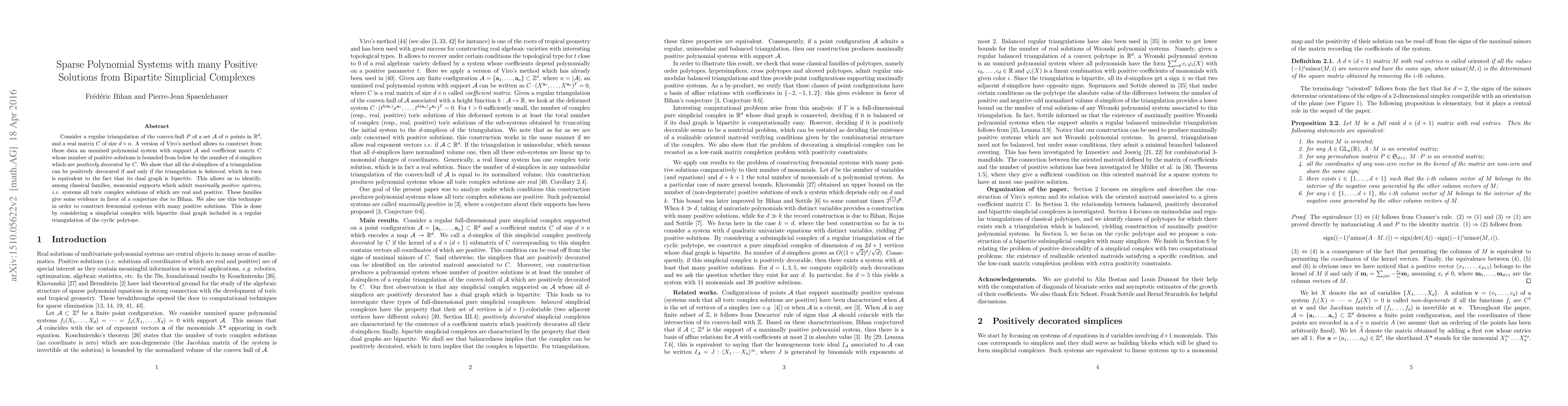 This paper explores the construction of sparse polynomial systems with many positive solutions using Viro's method, demonstrating that such systems can be derived from balanced triangulations of point sets whose dual graphs are bipartite. It also constructs fewnomial systems with many positive solutions by embedding simplicial complexes with bipartite dual graphs within regular triangulations of cyclic polytopes.