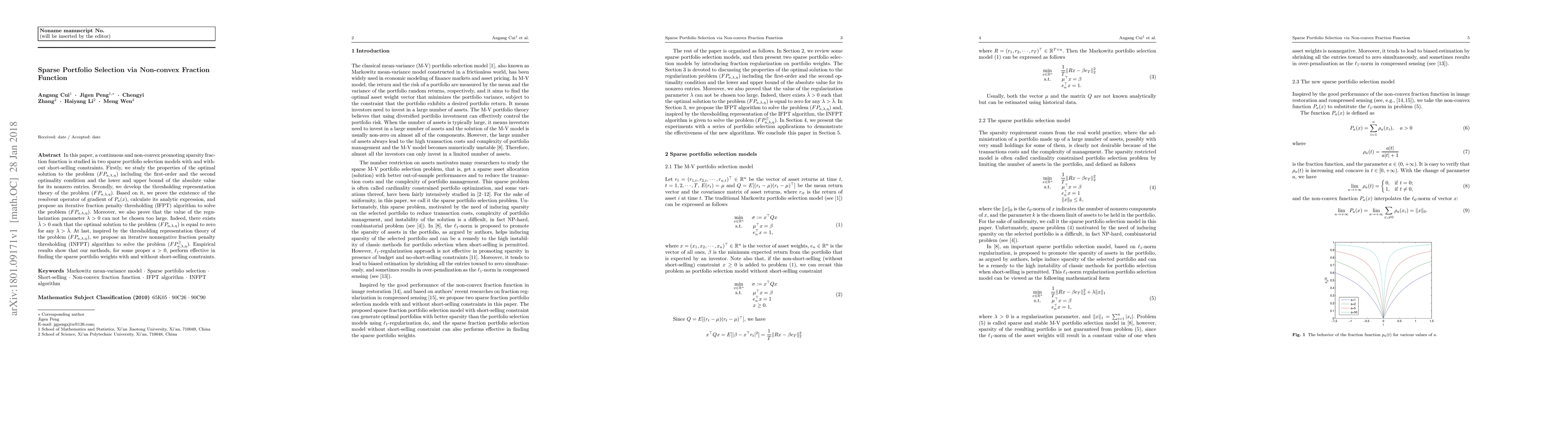 This paper proposes a non-convex promoting sparsity fraction function for sparse portfolio selection models, with and without short-selling constraints. It develops an iterative fraction penalty thresholding algorithm (IFPT) and proves the limitations on the regularization parameter $\lambda$. Empirical results indicate effective performance in identifying sparse portfolio weights.