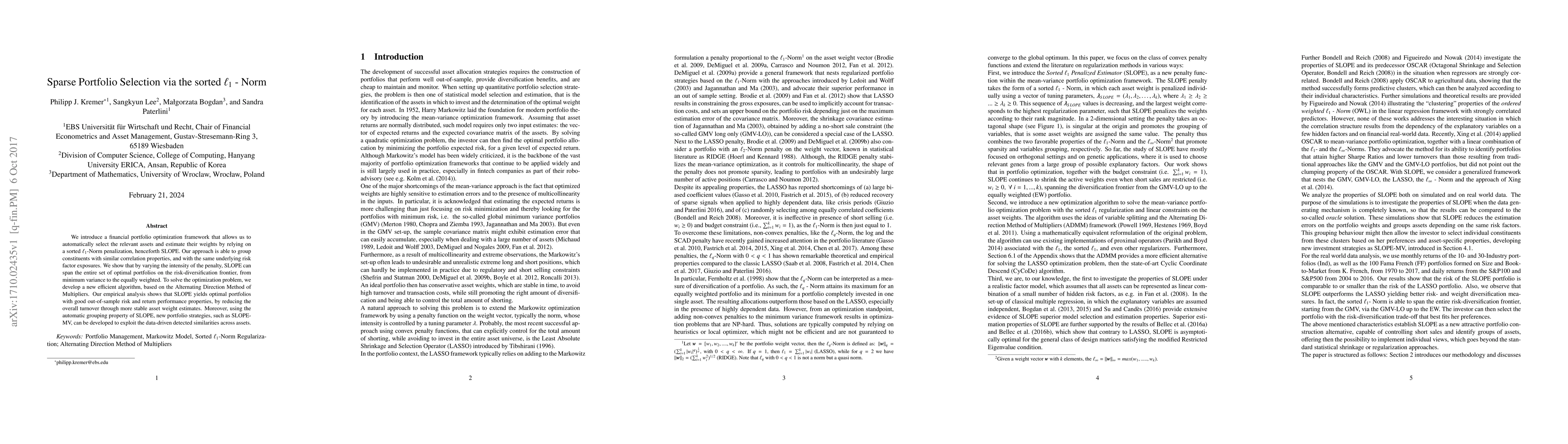 We introduce a financial portfolio optimization framework that allows us to automatically select the relevant assets and estimate their weights by relying on a sorted $\ell_1$-Norm penalization, henceforth SLOPE. Our approach is able to group constituents with similar correlation properties, and with the same underlying risk factor exposures. We show that by varying the intensity of the penalty, SLOPE can span the entire set of optimal portfolios on the risk-diversification frontier, from minimum variance to the equally weighted. To solve the optimization problem, we develop a new efficient algorithm, based on the Alternating Direction Method of Multipliers. Our empirical analysis shows that SLOPE yields optimal portfolios with good out-of-sample risk and return performance properties, by reducing the overall turnover through more stable asset weight estimates. Moreover, using the automatic grouping property of SLOPE, new portfolio strategies, such as SLOPE-MV, can be developed to exploit the data-driven detected similarities across assets.