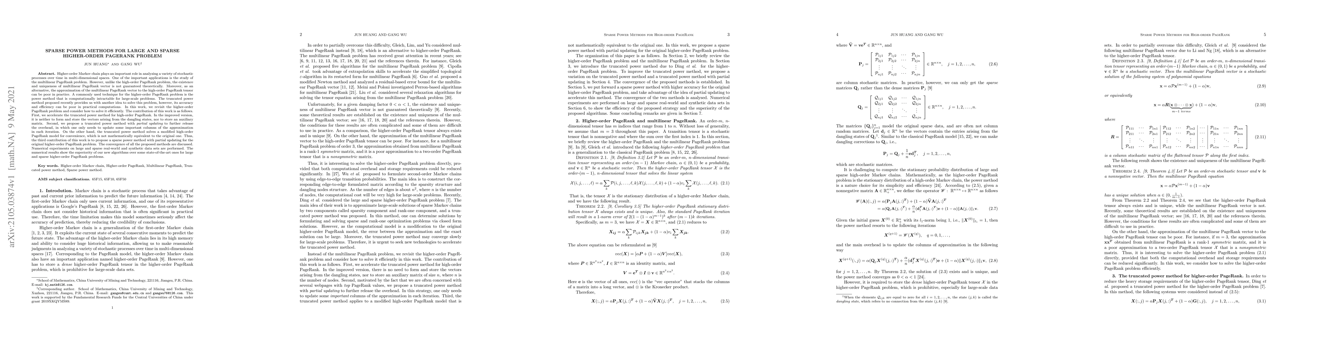 A commonly used technique for the higher-order PageRank problem is the power method that is computationally intractable for large-scale problems. The truncated power method proposed recently provides us with another idea to solve this problem, however, its accuracy and efficiency can be poor in practical computations. In this work, we revisit the higher-order PageRank problem and consider how to solve it efficiently. The contribution of this work is as follows. First, we accelerate the truncated power method for high-order PageRank. In the improved version, it is neither to form and store the vectors arising from the dangling states, nor to store an auxiliary matrix. Second, we propose a truncated power method with partial updating to further release the overhead, in which one only needs to update some important columns of the approximation in each iteration. On the other hand, the truncated power method solves a modified high-order PageRank model for convenience, which is not mathematically equivalent to the original one. Thus, the third contribution of this work is to propose a sparse power method with partial updating for the original higher-order PageRank problem. The convergence of all the proposed methods are discussed. Numerical experiments on large and sparse real-world and synthetic data sets are performed. The numerical results show the superiority of our new algorithms over some state-of-the-art ones for large and sparse higher-order PageRank problems.