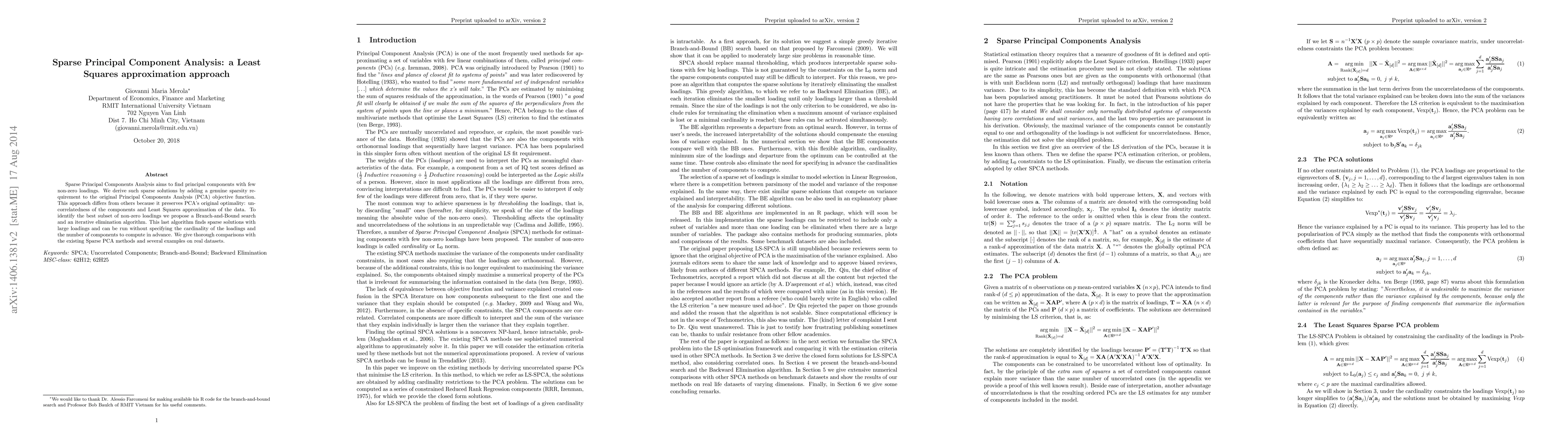 This paper proposes a new method for Sparse Principal Component Analysis (SPCA) that enhances the original PCA by incorporating a sparsity requirement, ensuring optimal components and Least Squares approximation. The authors introduce a Branch-and-Bound search and an iterative elimination algorithm to identify the best subset of non-zero loadings, which can be run without pre-specifying the number of components or loadings.