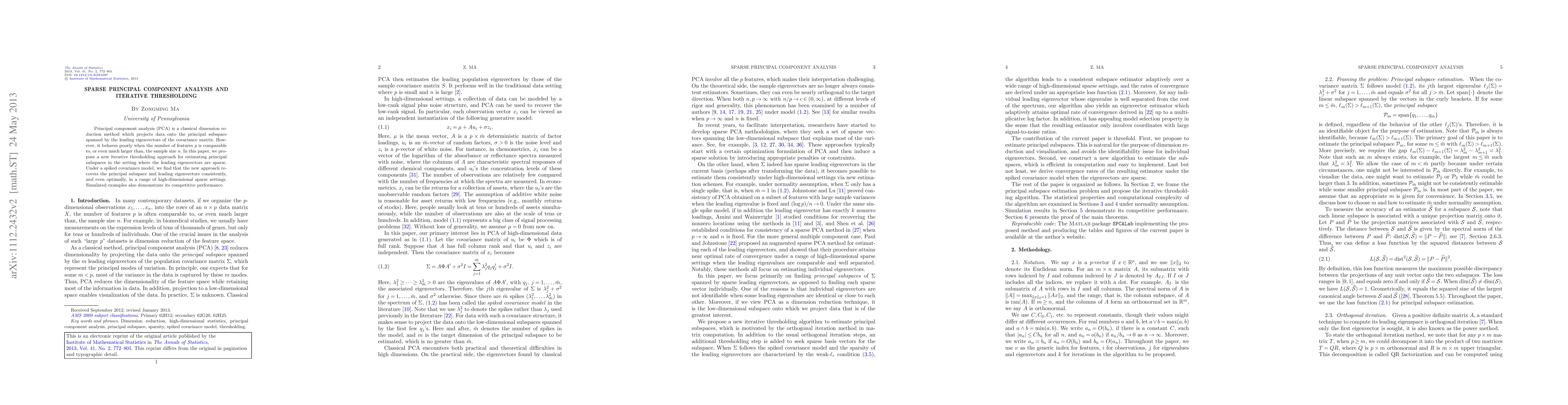 This paper proposes an iterative thresholding method for sparse principal component analysis (PCA) to improve dimension reduction when the number of features is large compared to the sample size. The new approach consistently and optimally recovers the principal subspace and leading eigenvectors under a spiked covariance model, outperforming traditional PCA in high-dimensional sparse settings.