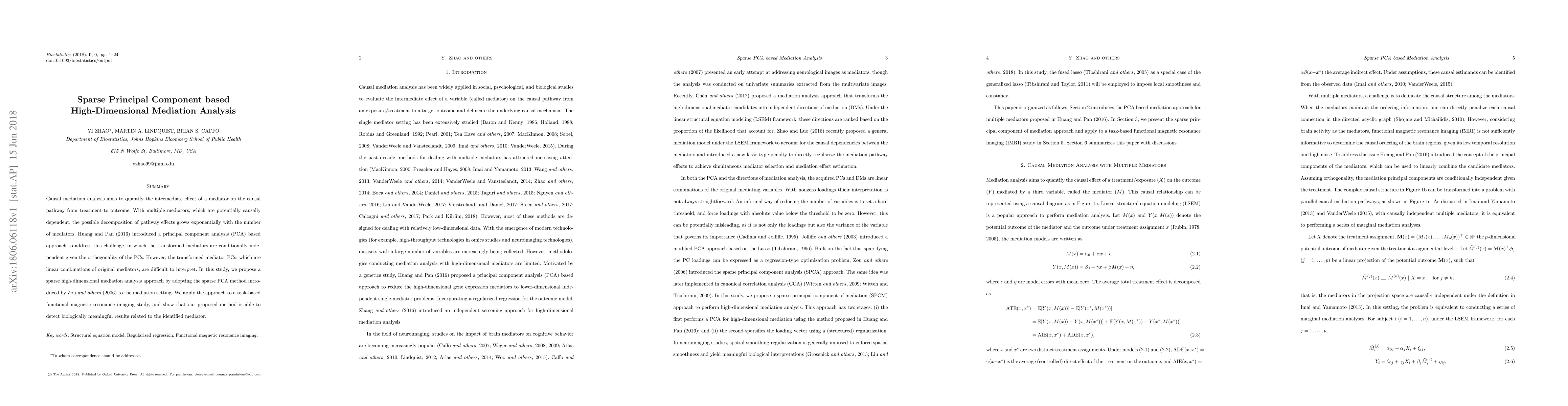 This paper proposes a sparse PCA method for high-dimensional mediation analysis to address the challenge of multiple potentially dependent mediators. The approach enhances interpretability and is demonstrated to detect biologically meaningful results in a functional MRI study.