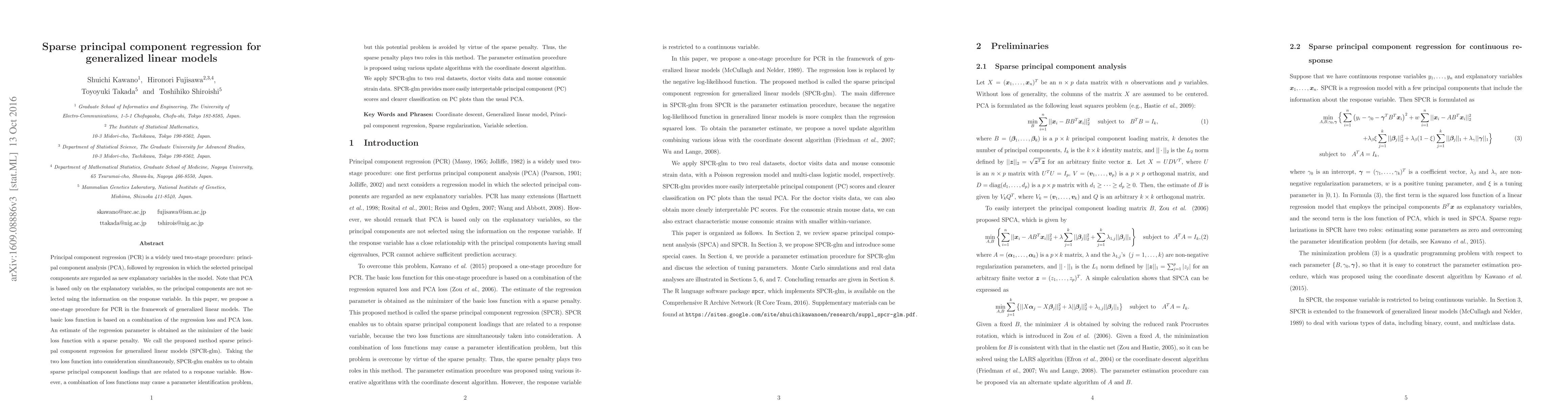 This paper introduces sparse principal component regression for generalized linear models (SPCR-glm), a one-stage method combining regression loss and PCA loss to obtain sparse principal components related to the response variable, avoiding parameter identification issues through a sparse penalty. The method is applied to real datasets, showing clearer classification and more interpretable principal component scores compared to standard PCA.