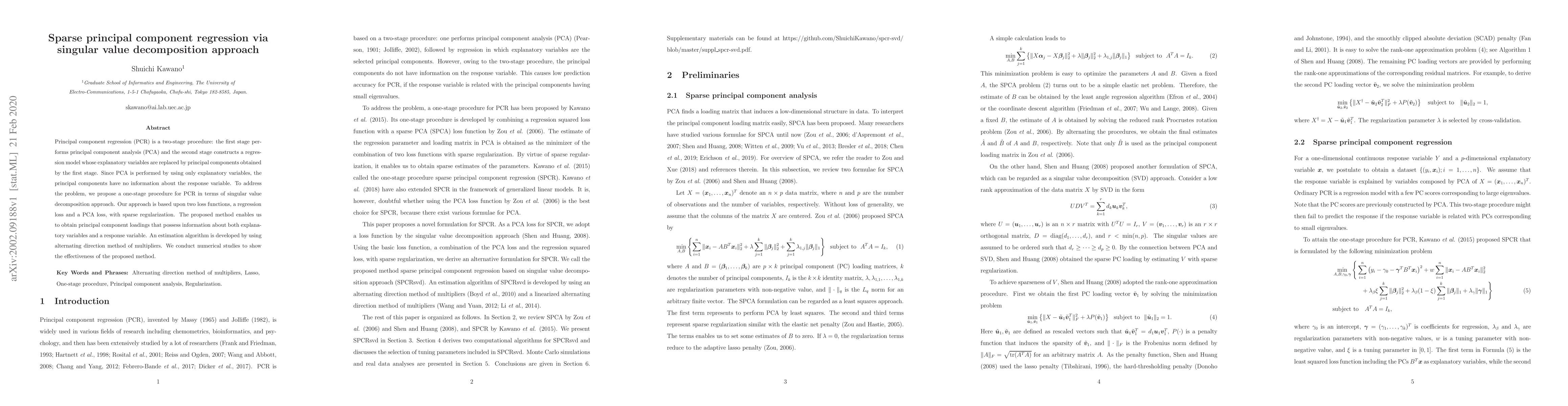 This paper proposes a one-stage sparse principal component regression method using singular value decomposition, combining regression and PCA losses with sparse regularization to incorporate response variable information. An alternating direction method of multipliers is used for estimation, and numerical studies demonstrate its effectiveness.