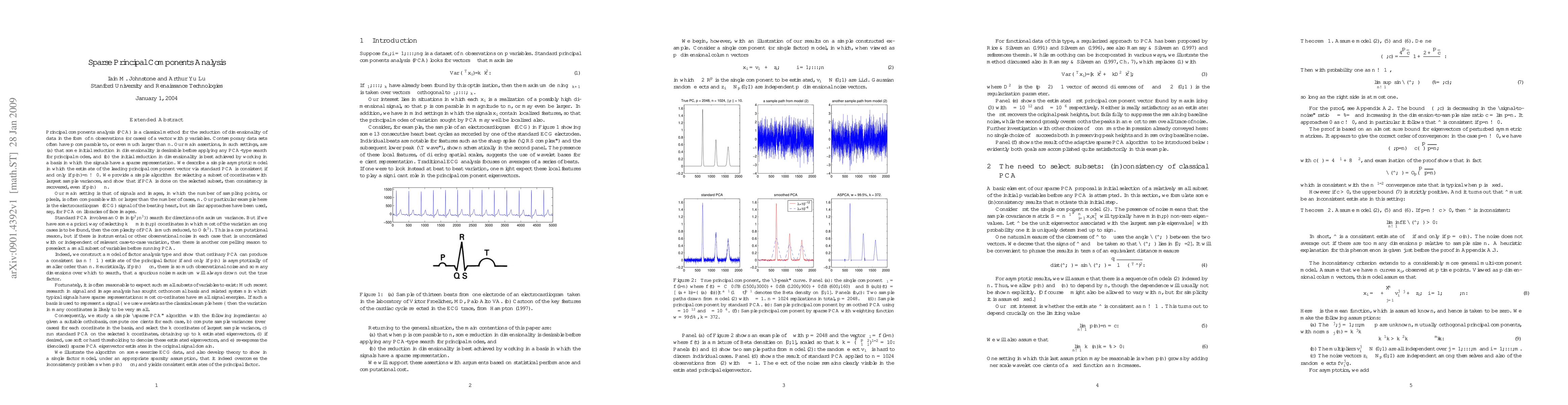 This paper proposes a "sparse PCA" algorithm to improve PCA by focusing on coordinates with the largest variance, demonstrating its effectiveness on exercise ECG data and proving its consistency under a single factor model with sparsity assumptions.