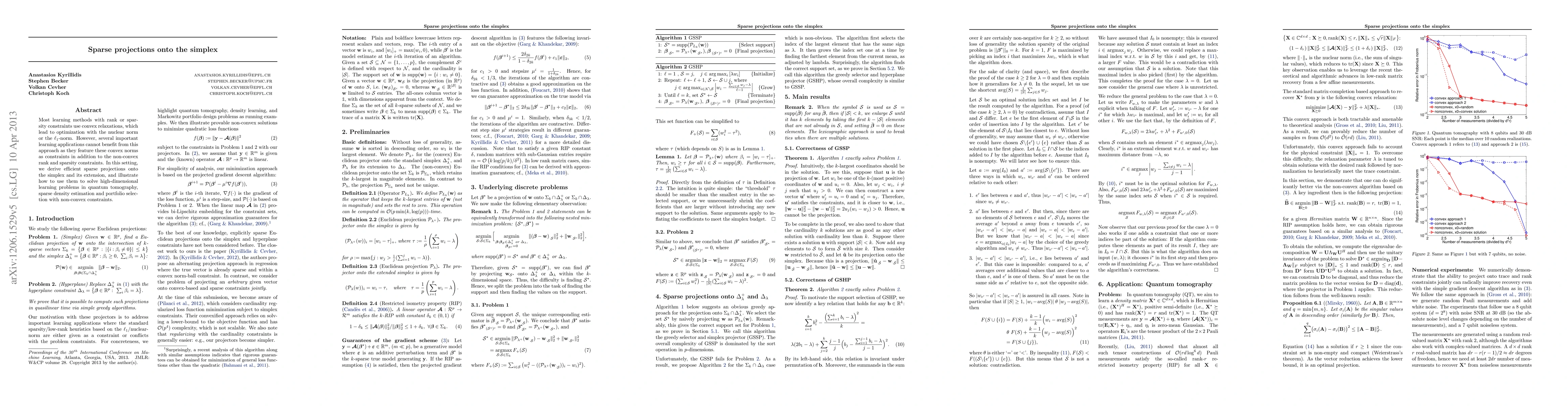 Researchers developed efficient methods for sparse projections onto the simplex to solve complex learning problems with non-convex constraints in quantum tomography, density estimation, and portfolio selection.