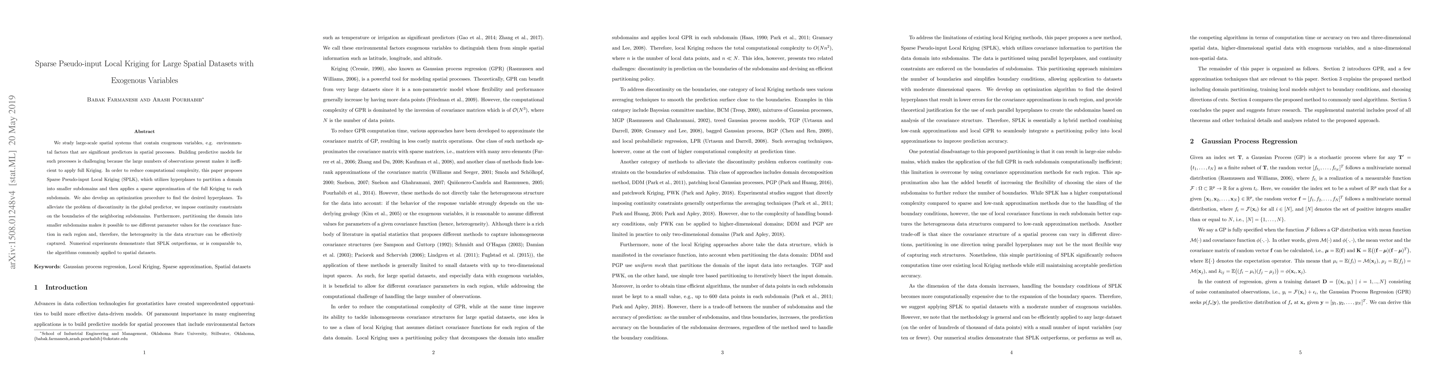 We study large-scale spatial systems that contain exogenous variables, e.g. environmental factors that are significant predictors in spatial processes. Building predictive models for such processes is challenging because the large numbers of observations present makes it inefficient to apply full Kriging. In order to reduce computational complexity, this paper proposes Sparse Pseudo-input Local Kriging (SPLK), which utilizes hyperplanes to partition a domain into smaller subdomains and then applies a sparse approximation of the full Kriging to each subdomain. We also develop an optimization procedure to find the desired hyperplanes. To alleviate the problem of discontinuity in the global predictor, we impose continuity constraints on the boundaries of the neighboring subdomains. Furthermore, partitioning the domain into smaller subdomains makes it possible to use different parameter values for the covariance function in each region and, therefore, the heterogeneity in the data structure can be effectively captured. Numerical experiments demonstrate that SPLK outperforms, or is comparable to, the algorithms commonly applied to spatial datasets.