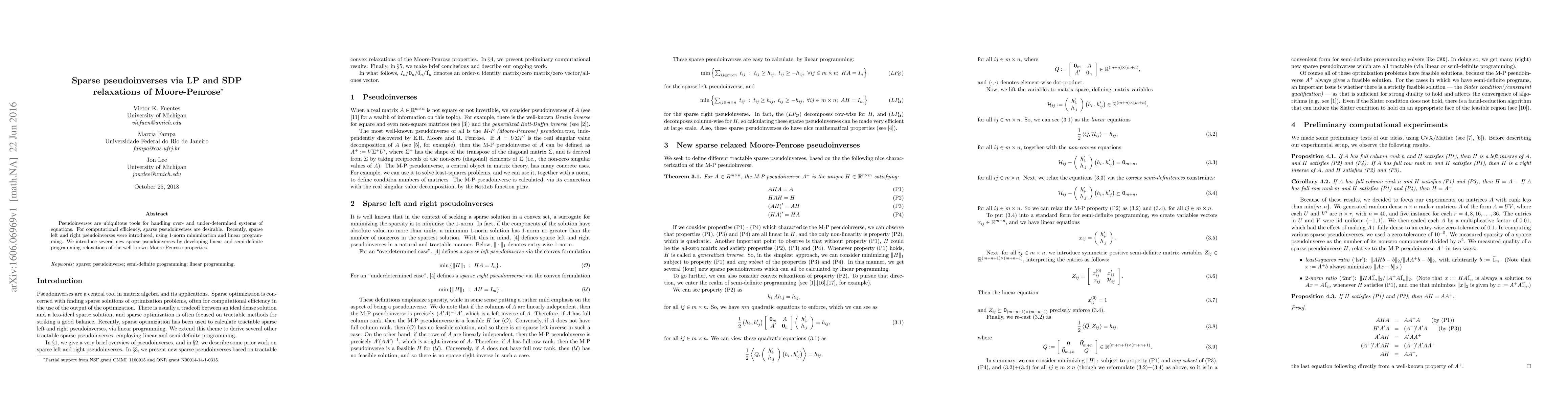 This paper introduces new sparse pseudoinverses using linear programming (LP) and semi-definite programming (SDP) relaxations based on the Moore-Penrose properties, aiming to improve computational efficiency for over- and under-determined systems. These methods offer alternatives to traditional 1-norm minimization techniques.