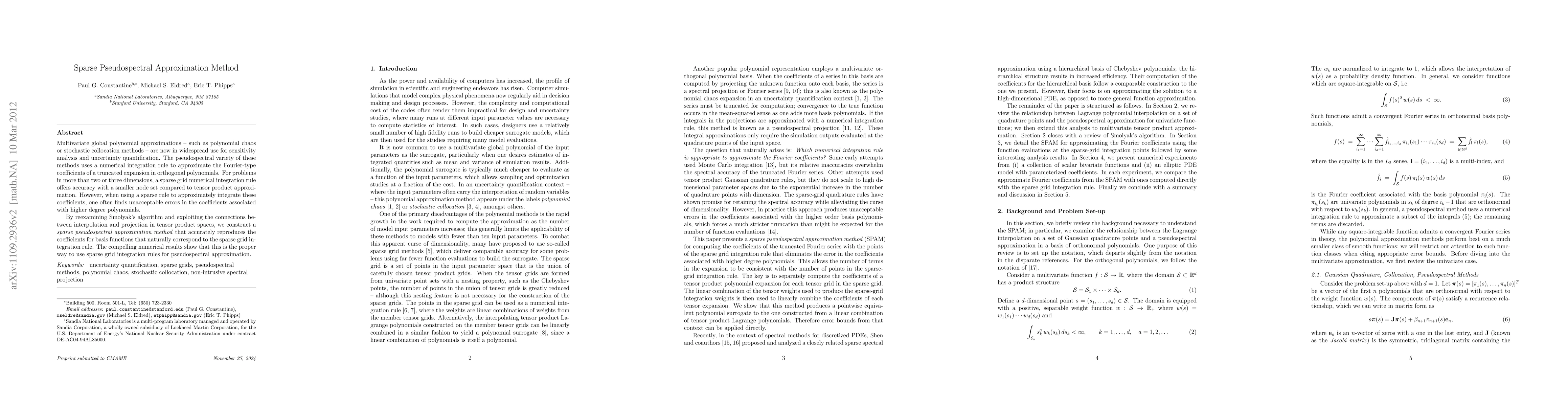 This paper proposes a sparse pseudospectral approximation method that leverages Smolyak's algorithm to accurately reproduce the Fourier-type coefficients in multivariate polynomial expansions, addressing errors in higher-degree polynomials typically encountered with sparse grid integration rules. The method demonstrates improved accuracy and efficiency for high-dimensional problems.