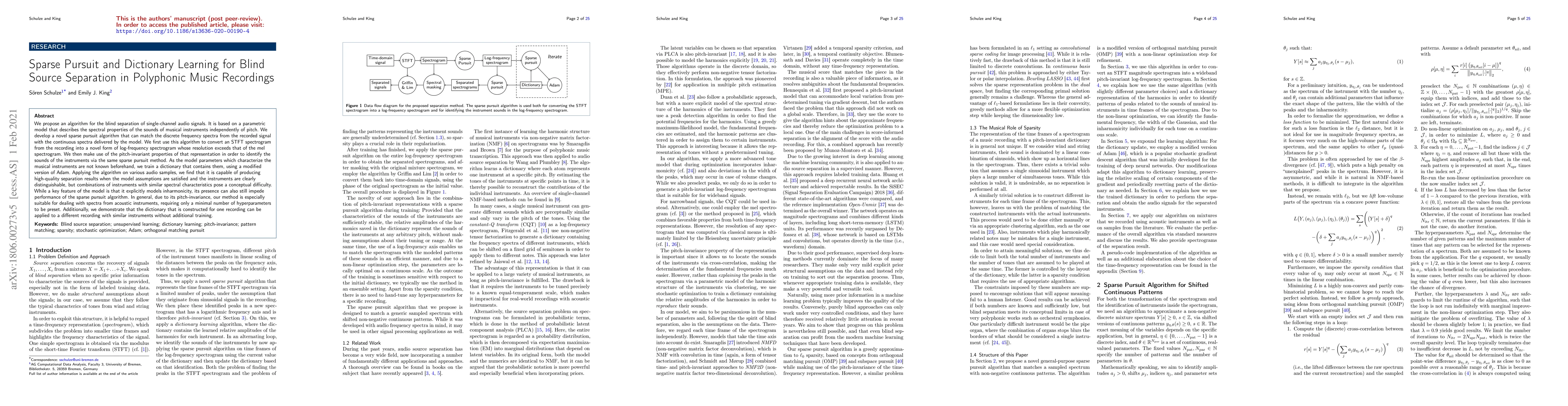 This paper proposes an algorithm for blind source separation in polyphonic music using sparse pursuit and dictionary learning. It converts STFT spectrograms into a high-resolution log-frequency spectrogram and identifies instruments via pitch-invariant properties, achieving high-quality separation when instruments are distinct but struggling with similar spectral characteristics.