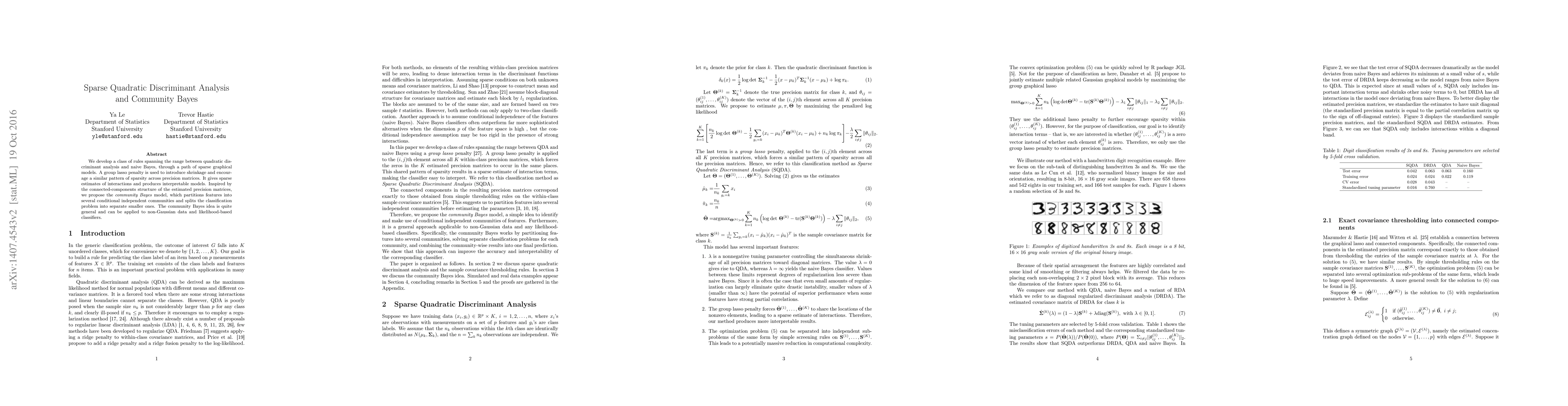 This paper introduces a sparse quadratic discriminant analysis method that blends quadratic discriminant analysis and naive Bayes through sparse graphical models, using a group lasso penalty for interpretable interaction estimates. The proposed community Bayes model further partitions features into independent communities, simplifying classification into smaller problems.