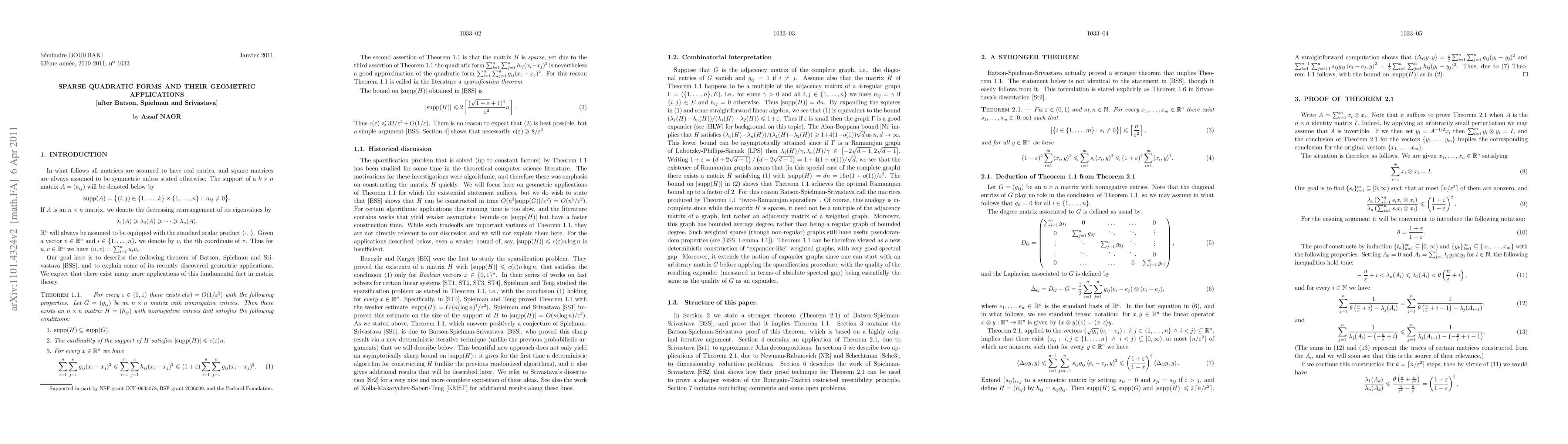 Summary: This paper surveys the contributions of Batson, Spielman, and Srivastava on graph sparsification, focusing on how their techniques have led to new geometric applications in various fields. The work highlights the importance of sparse quadratic forms in simplifying complex graph structures.