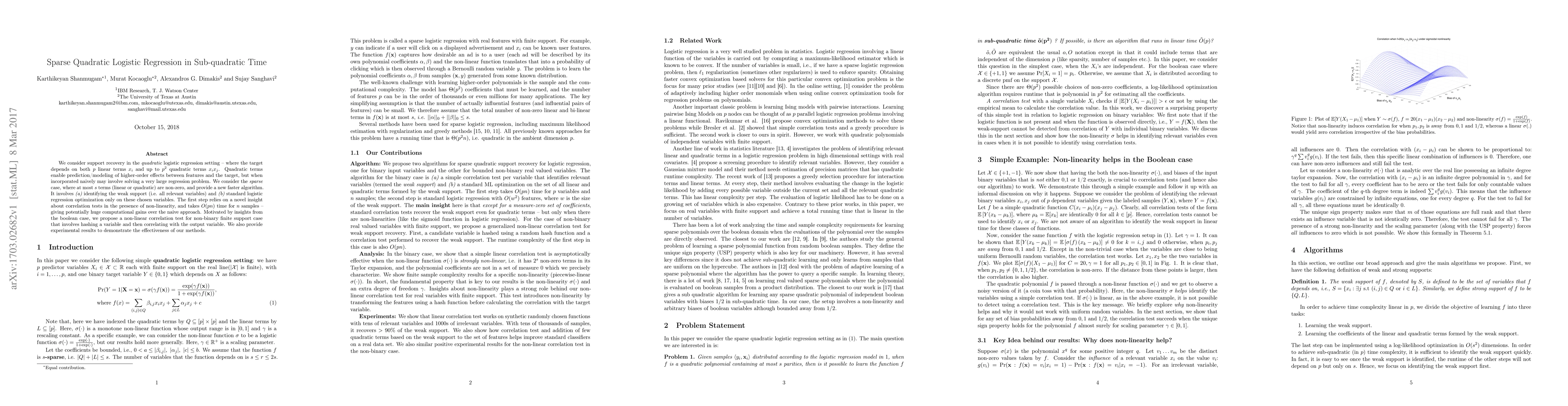 This paper presents a novel sparse quadratic logistic regression algorithm that achieves sub-quadratic time complexity by identifying weak supports and optimizing logistic regression on these variables, significantly reducing computational costs compared to naive methods. The proposed method includes a non-linear correlation test for identifying relevant variables, demonstrating substantial efficiency gains.