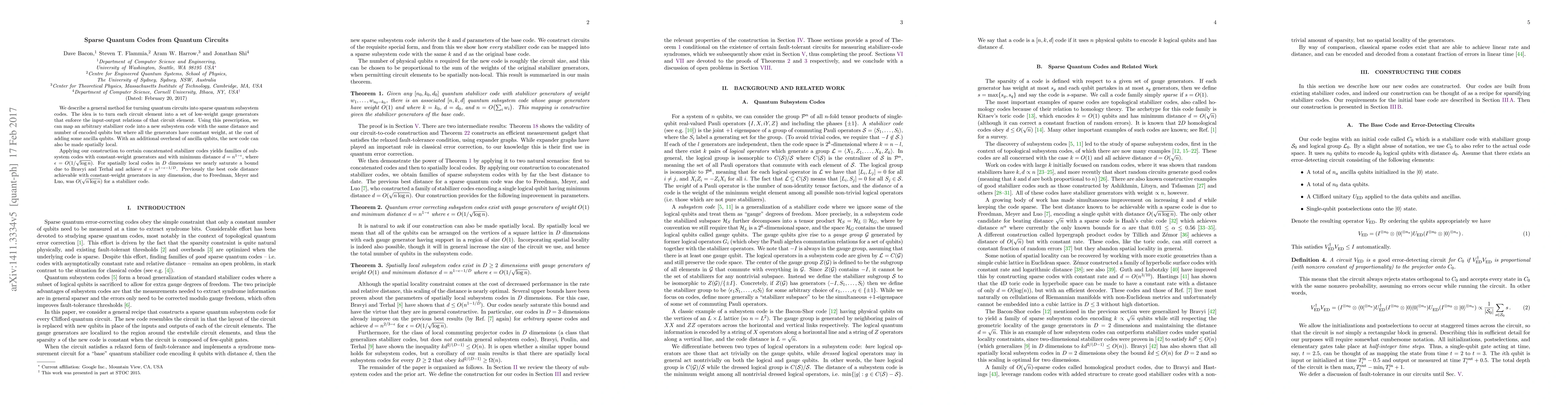 We describe a general method for turning quantum circuits into sparse quantum subsystem codes. The idea is to turn each circuit element into a set of low-weight gauge generators that enforce the input-output relations of that circuit element. Using this prescription, we can map an arbitrary stabilizer code into a new subsystem code with the same distance and number of encoded qubits but where all the generators have constant weight, at the cost of adding some ancilla qubits. With an additional overhead of ancilla qubits, the new code can also be made spatially local. Applying our construction to certain concatenated stabilizer codes yields families of subsystem codes with constant-weight generators and with minimum distance $d = n^{1-\epsilon}$, where $\epsilon = O(1/\sqrt{\log n})$. For spatially local codes in $D$ dimensions we nearly saturate a bound due to Bravyi and Terhal and achieve $d = n^{1-\epsilon-1/D}$. Previously the best code distance achievable with constant-weight generators in any dimension, due to Freedman, Meyer and Luo, was $O(\sqrt{n\log n})$ for a stabilizer code.