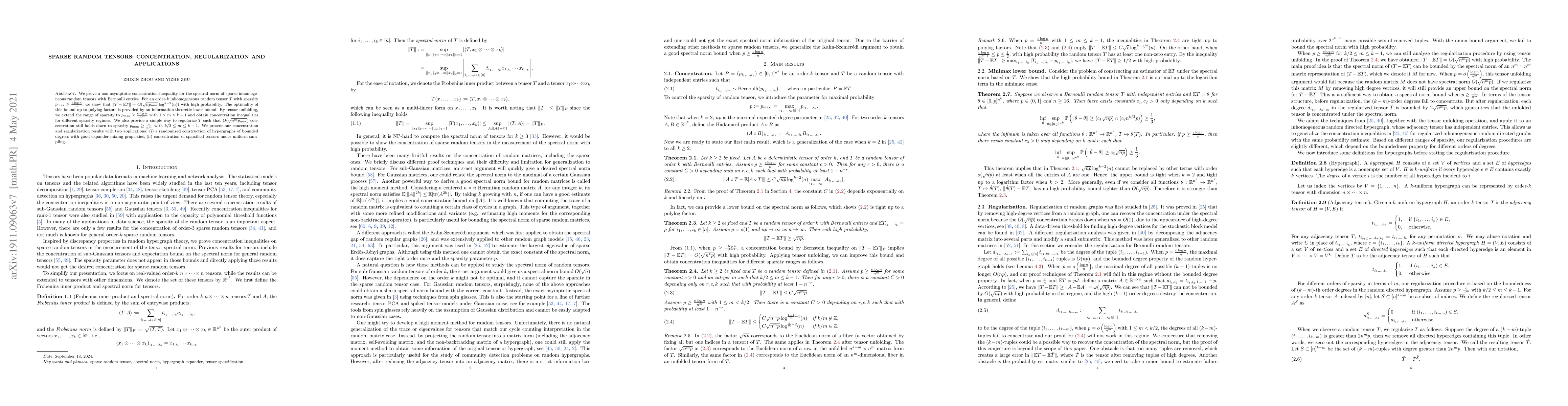 The paper establishes concentration inequalities for sparse random tensors and presents a regularization method to maintain concentration properties, which are novel contributions to the field.