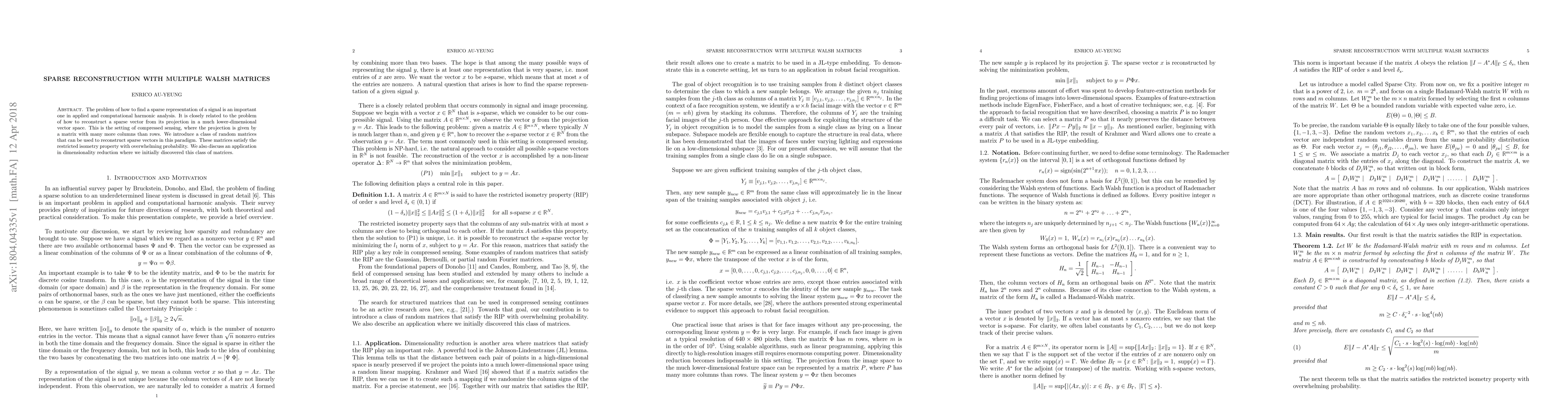 The problem of how to find a sparse representation of a signal is an important one in applied and computational harmonic analysis. It is closely related to the problem of how to reconstruct a sparse vector from its projection in a much lower-dimensional vector space. This is the setting of compressed sensing, where the projection is given by a matrix with many more columns than rows. We introduce a class of random matrices that can be used to reconstruct sparse vectors in this paradigm. These matrices satisfy the restricted isometry property with overwhelming probability. We also discuss an application in dimensionality reduction where we initially discovered this class of matrices.