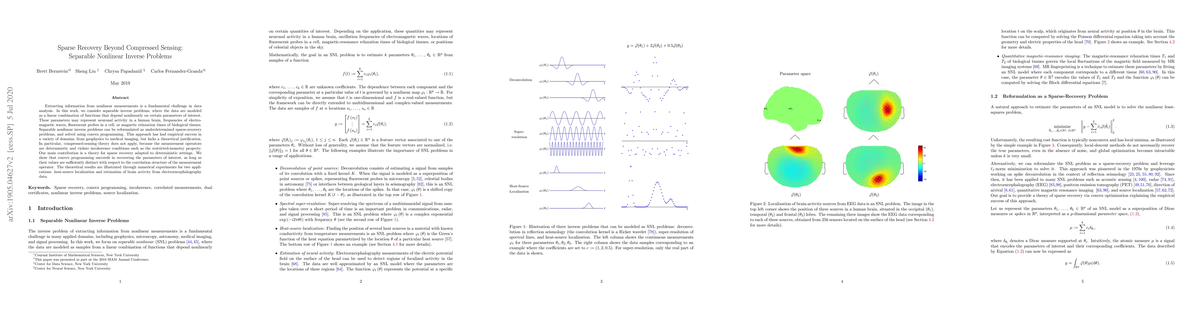 This paper develops a theoretical framework for solving separable nonlinear inverse problems through convex programming, extending beyond compressed sensing to deterministic settings. It demonstrates successful parameter recovery when parameter values are sufficiently distinct, illustrated through applications in heat-source localization and EEG brain activity estimation.