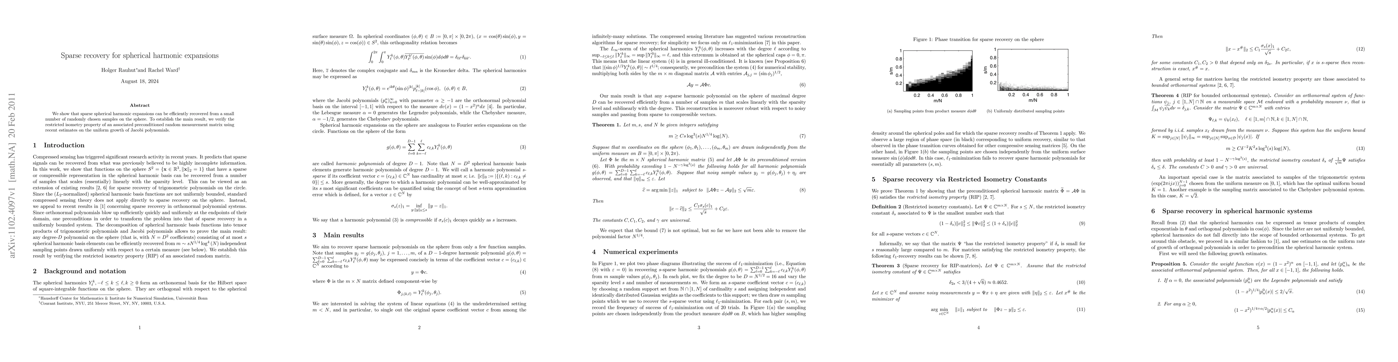 Summary: This paper demonstrates efficient recovery of sparse spherical harmonic expansions from a minimal number of random samples, leveraging the restricted isometry property of a preconditioned random measurement matrix and recent estimates on the uniform growth of Jacobi polynomials.