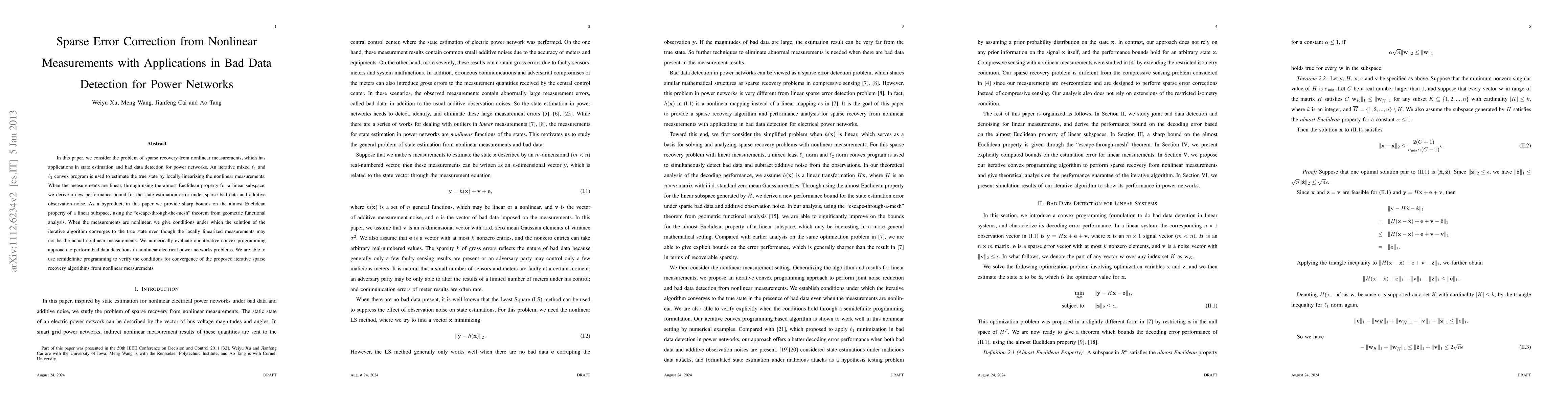 This paper proposes an iterative mixed $\ell_1$ and $\ell_2$ convex program for sparse recovery from nonlinear measurements, applying it to state estimation and bad data detection in power networks. It provides performance bounds for linear measurements and convergence conditions for nonlinear cases, validated through numerical evaluations and semidefinite programming.