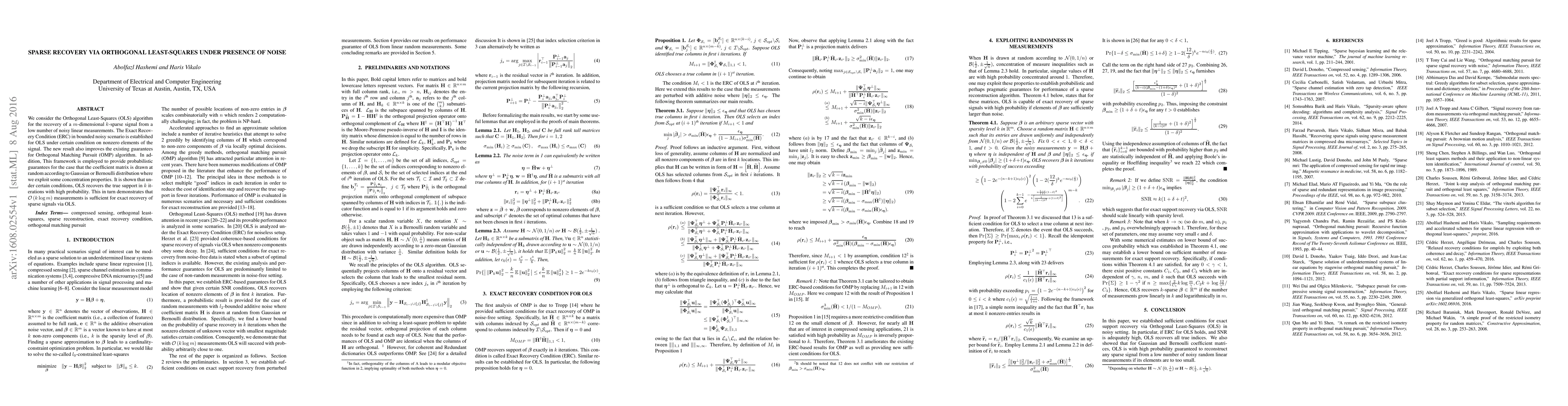 This paper establishes the Exact Recovery Condition for Orthogonal Least-Squares (OLS) in noisy scenarios, improving upon existing guarantees for Orthogonal Matching Pursuit (OMP). It demonstrates that OLS can recover $k$-sparse signals with ${\cal O}(k\log m)$ measurements under certain conditions.