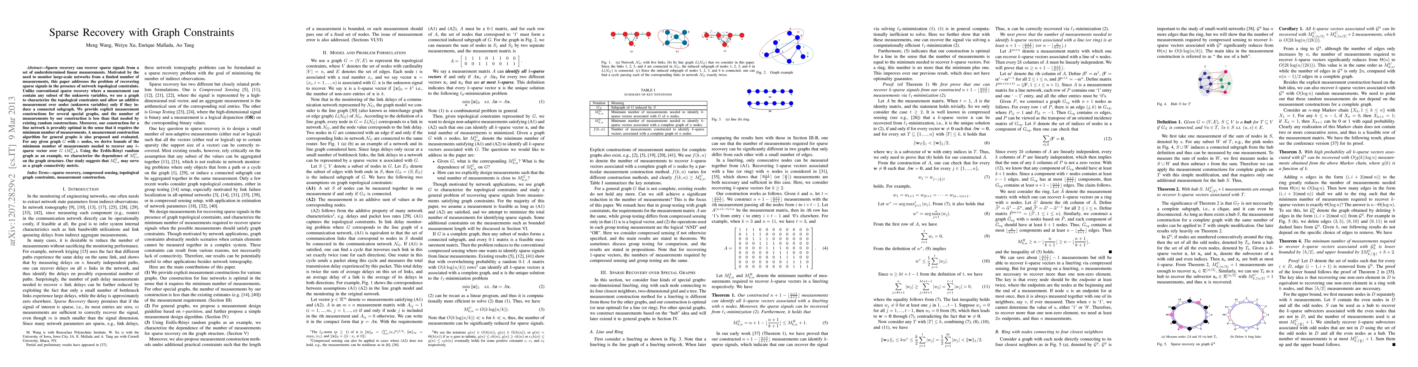 This paper presents a novel approach to sparse signal recovery under network topological constraints, utilizing graph structures to limit measurements to connected subgraphs. It provides optimal measurement constructions for specific graph types and develops a general algorithm, deriving bounds for the minimum number of measurements required for any given graph.