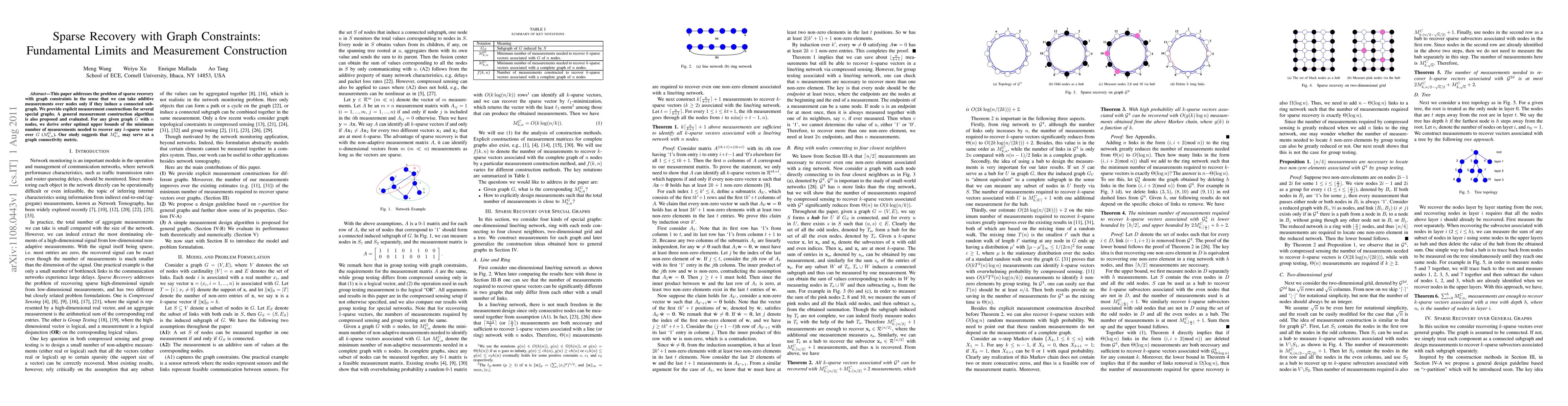 This paper explores sparse recovery under graph constraints, where measurements are only allowed over connected subgraphs. It presents explicit measurement constructions for specific graphs and a general algorithm, deriving optimal bounds for the minimum number of measurements needed to recover $k$-sparse vectors, suggesting these bounds may reflect graph connectivity.