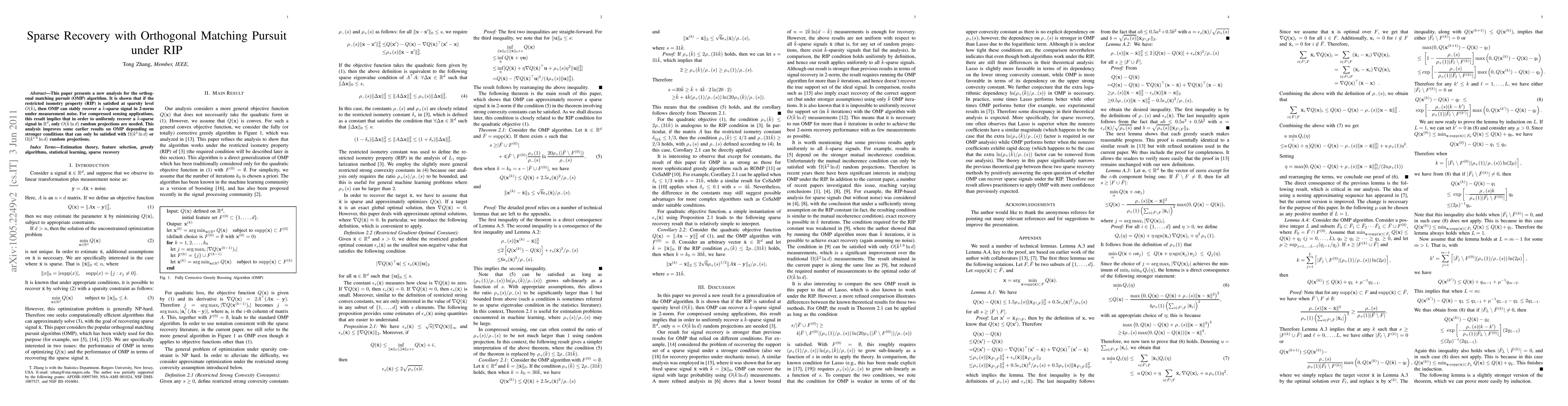 This paper analyzes the orthogonal matching pursuit (OMP) algorithm under the restricted isometry property (RIP), showing it can recover $\bar{k}$-sparse signals with $O(\bar{k} \ln d)$ random projections, improving earlier results requiring stronger conditions and more projections.