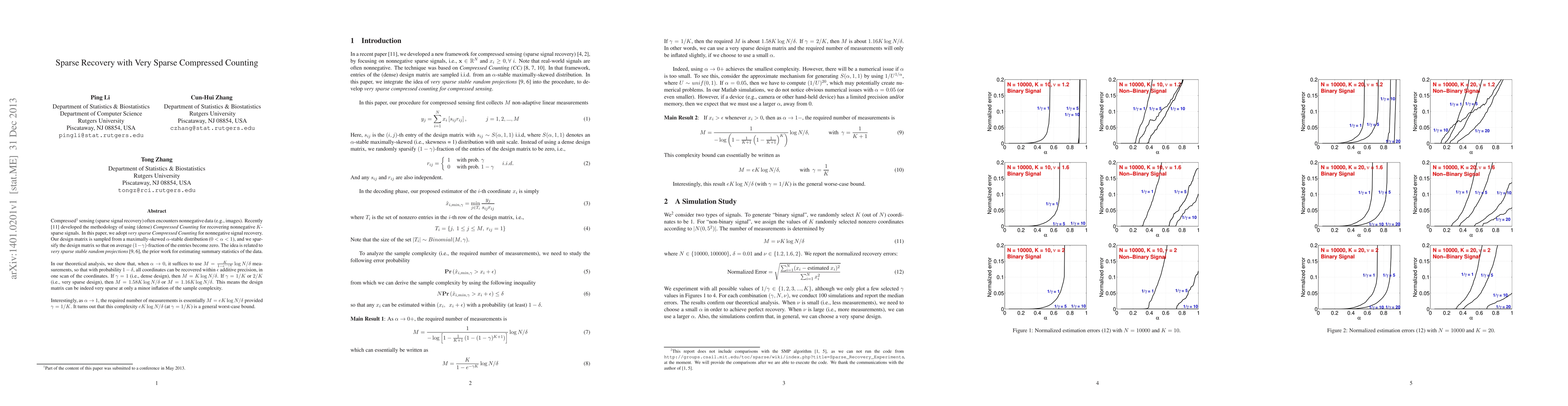 This paper introduces very sparse Compressed Counting for recovering nonnegative K-sparse signals, employing a design matrix sampled from a maximally-skewed p-stable distribution. It demonstrates that sparse matrices can achieve nearly optimal recovery with minimal increase in measurement complexity compared to dense matrices.
