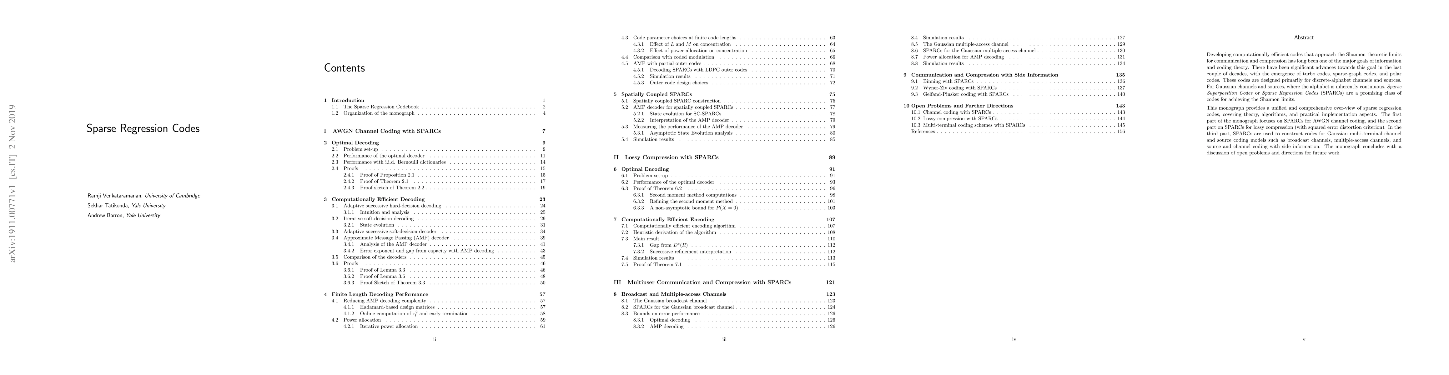 Developing computationally-efficient codes that approach the Shannon-theoretic limits for communication and compression has long been one of the major goals of information and coding theory. There have been significant advances towards this goal in the last couple of decades, with the emergence of turbo codes, sparse-graph codes, and polar codes. These codes are designed primarily for discrete-alphabet channels and sources. For Gaussian channels and sources, where the alphabet is inherently continuous, Sparse Superposition Codes or Sparse Regression Codes (SPARCs) are a promising class of codes for achieving the Shannon limits. This survey provides a unified and comprehensive overview of sparse regression codes, covering theory, algorithms, and practical implementation aspects. The first part of the monograph focuses on SPARCs for AWGN channel coding, and the second part on SPARCs for lossy compression (with squared error distortion criterion). In the third part, SPARCs are used to construct codes for Gaussian multi-terminal channel and source coding models such as broadcast channels, multiple-access channels, and source and channel coding with side information. The survey concludes with a discussion of open problems and directions for future work.