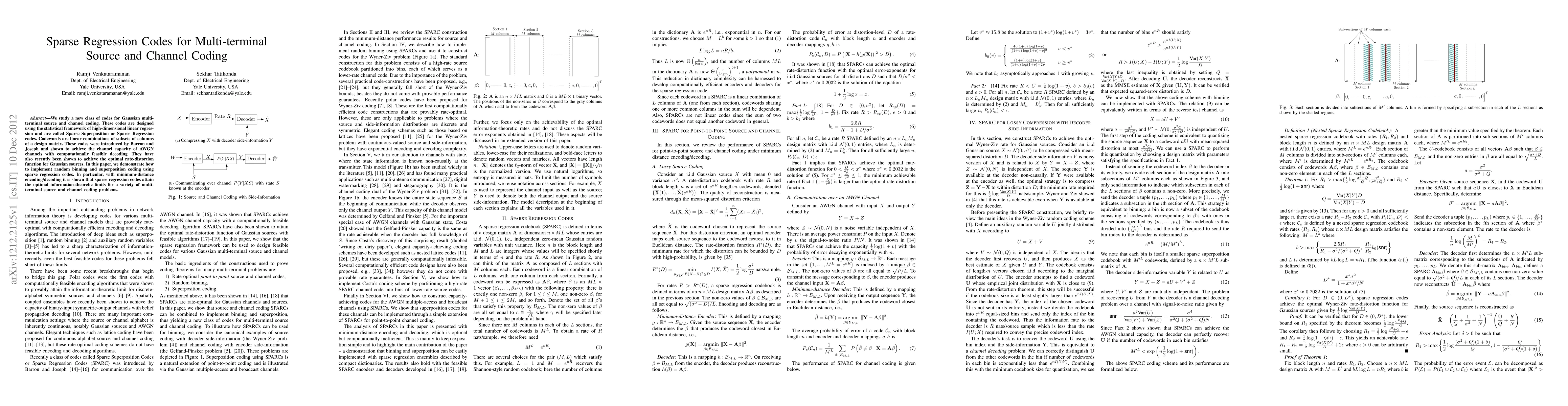This paper introduces Sparse Regression codes for Gaussian multi-terminal source and channel coding, demonstrating their implementation via random binning and superposition. The codes achieve optimal information-theoretic limits for various multi-terminal problems, leveraging high-dimensional linear regression.