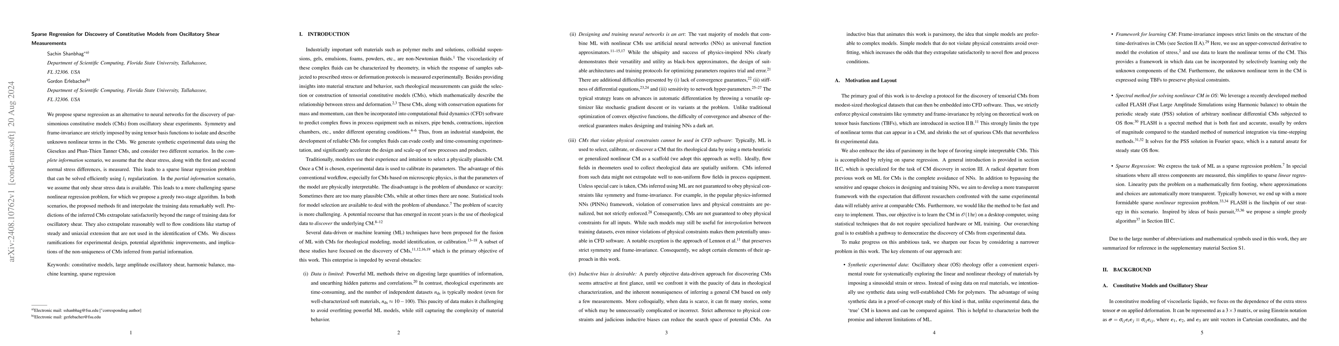 This paper proposes sparse regression over neural networks for discovering constitutive models from oscillatory shear measurements, emphasizing symmetry and frame-invariance via tensor basis functions. It successfully fits and extrapolates models inferred from complete and partial information scenarios using $l_1$ regularization and a two-stage algorithm, respectively.
