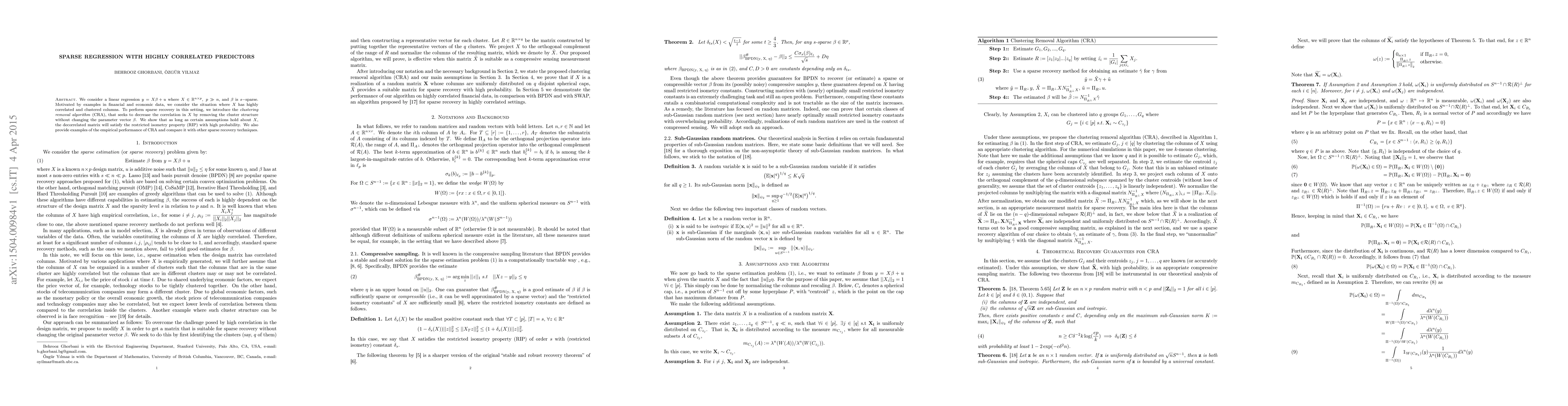 This paper proposes a clustering removal algorithm (CRA) to address sparse regression in settings with highly correlated predictors, demonstrating that it can effectively reduce correlation while preserving the parameter vector. The authors show that under certain conditions, the modified matrix satisfies the restricted isometry property, and provide empirical comparisons to other sparse recovery techniques.