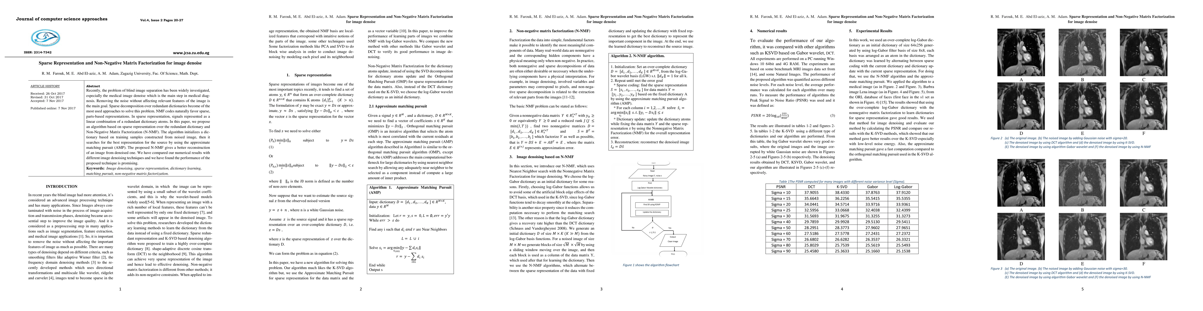 Recently, the problem of blind image separation has been widely investigated, especially the medical image denoise which is the main step in medical diag-nosis. Removing the noise without affecting relevant features of the image is the main goal. Sparse decomposition over redundant dictionaries become of the most used approaches to solve this problem. NMF codes naturally favor sparse, parts-based representations. In sparse representation, signals represented as a linear combination of a redundant dictionary atoms. In this paper, we propose an algorithm based on sparse representation over the redundant dictionary and Non-Negative Matrix Factorization (N-NMF). The algorithm initializes a dic-tionary based on training samples constructed from noised image, then it searches for the best representation for the source by using the approximate matching pursuit (AMP). The proposed N-NMF gives a better reconstruction of an image from denoised one. We have compared our numerical results with different image denoising techniques and we have found the performance of the proposed technique is promising. Keywords: Image denoising, sparse representation, dictionary learning, matching pursuit, non-negative matrix factorization.