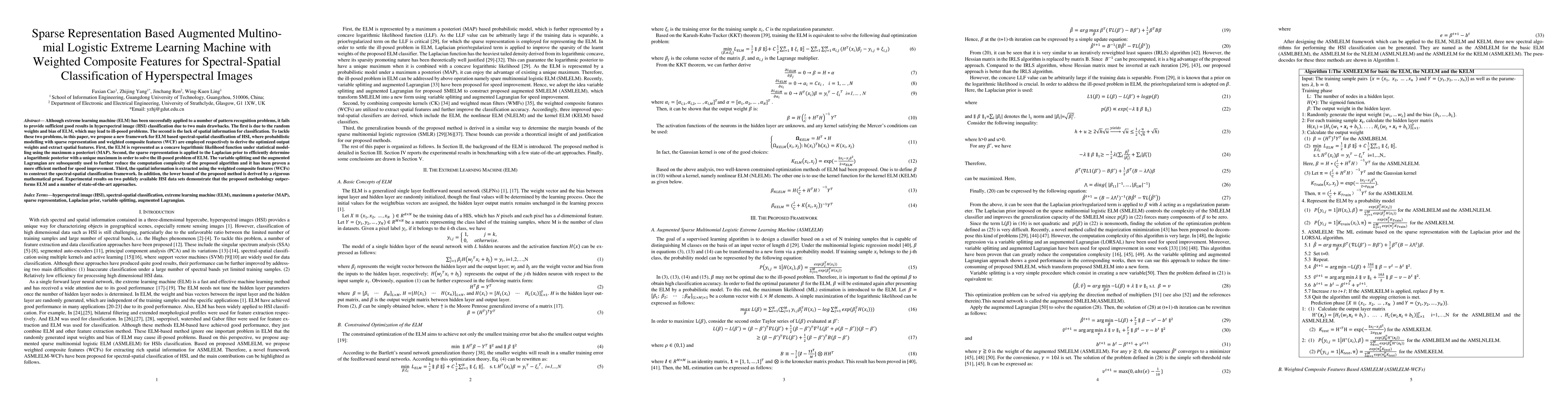 Although extreme learning machine (ELM) has been successfully applied to a number of pattern recognition problems, it fails to pro-vide sufficient good results in hyperspectral image (HSI) classification due to two main drawbacks. The first is due to the random weights and bias of ELM, which may lead to ill-posed problems. The second is the lack of spatial information for classification. To tackle these two problems, in this paper, we propose a new framework for ELM based spectral-spatial classification of HSI, where probabilistic modelling with sparse representation and weighted composite features (WCF) are employed respectively to derive the op-timized output weights and extract spatial features. First, the ELM is represented as a concave logarithmic likelihood function under statistical modelling using the maximum a posteriori (MAP). Second, the sparse representation is applied to the Laplacian prior to effi-ciently determine a logarithmic posterior with a unique maximum in order to solve the ill-posed problem of ELM. The variable splitting and the augmented Lagrangian are subsequently used to further reduce the computation complexity of the proposed algorithm and it has been proven a more efficient method for speed improvement. Third, the spatial information is extracted using the weighted compo-site features (WCFs) to construct the spectral-spatial classification framework. In addition, the lower bound of the proposed method is derived by a rigorous mathematical proof. Experimental results on two publicly available HSI data sets demonstrate that the proposed methodology outperforms ELM and a number of state-of-the-art approaches.