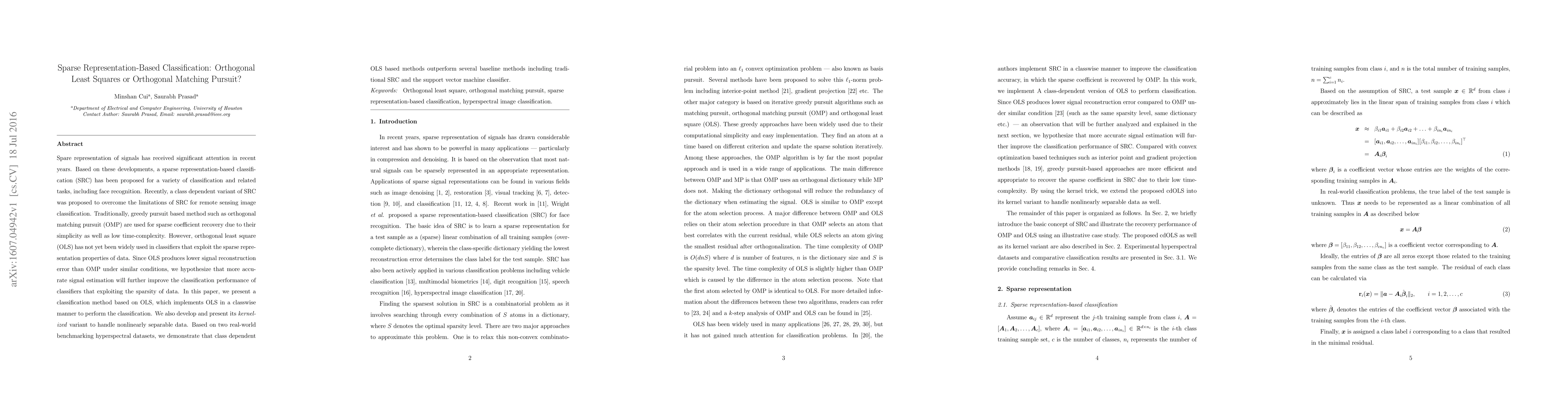 Spare representation of signals has received significant attention in recent years. Based on these developments, a sparse representation-based classification (SRC) has been proposed for a variety of classification and related tasks, including face recognition. Recently, a class dependent variant of SRC was proposed to overcome the limitations of SRC for remote sensing image classification. Traditionally, greedy pursuit based method such as orthogonal matching pursuit (OMP) are used for sparse coefficient recovery due to their simplicity as well as low time-complexity. However, orthogonal least square (OLS) has not yet been widely used in classifiers that exploit the sparse representation properties of data. Since OLS produces lower signal reconstruction error than OMP under similar conditions, we hypothesize that more accurate signal estimation will further improve the classification performance of classifiers that exploiting the sparsity of data. In this paper, we present a classification method based on OLS, which implements OLS in a classwise manner to perform the classification. We also develop and present its kernelized variant to handle nonlinearly separable data. Based on two real-world benchmarking hyperspectral datasets, we demonstrate that class dependent OLS based methods outperform several baseline methods including traditional SRC and the support vector machine classifier.