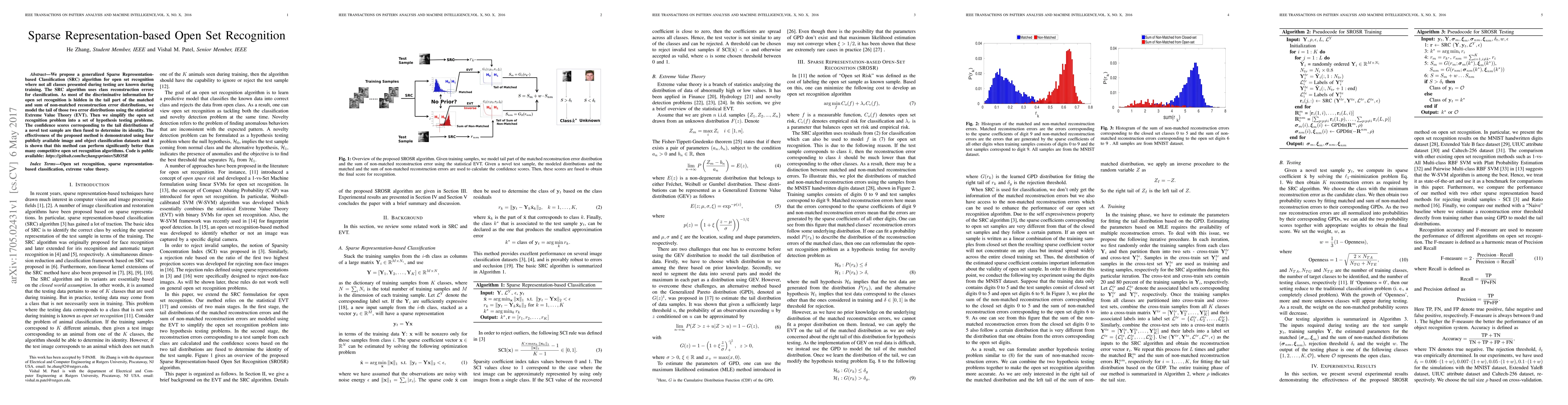 This paper proposes a generalized Sparse Representation-based Classification (SRC) algorithm for open set recognition, utilizing Extreme Value Theory (EVT) to model error distributions and improve classification of unknown classes. The method outperforms other open set recognition algorithms, as demonstrated on multiple datasets.