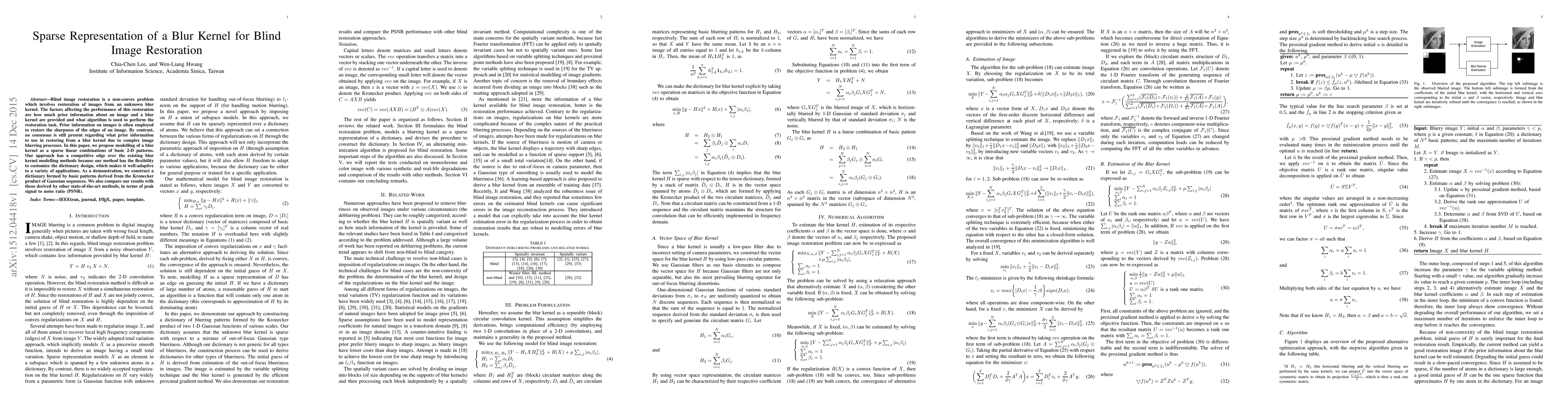 This paper proposes a sparse representation of a blur kernel for blind image restoration, modeling the kernel as a sparse linear combination of basic 2-D patterns. The method allows for flexible dictionary design, demonstrating its effectiveness through a dictionary derived from Gaussian sequences and comparing results with state-of-the-art methods based on PSNR.