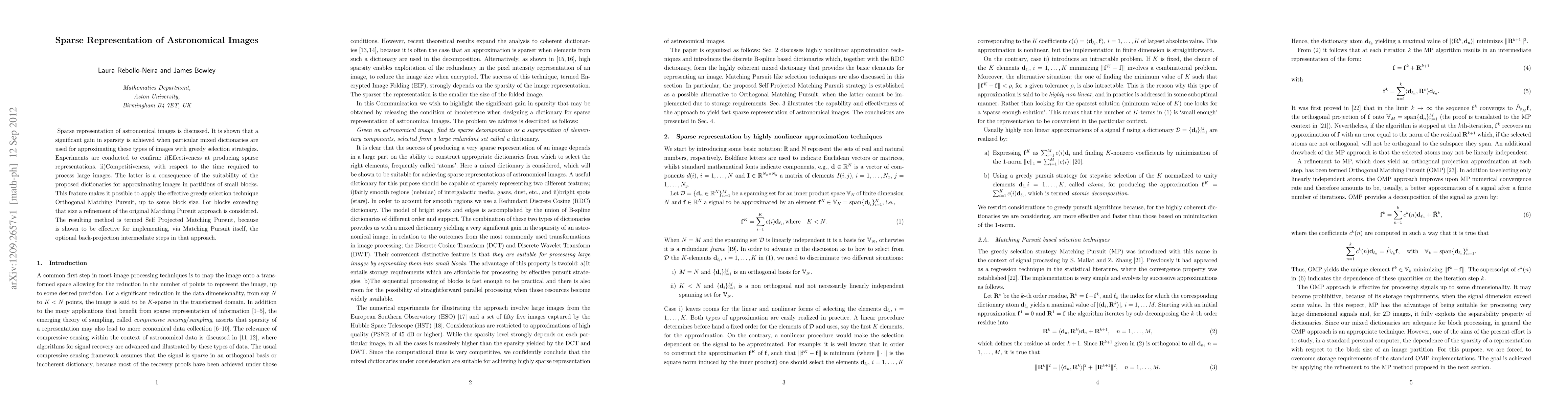 Sparse representation of astronomical images is discussed. It is shown that a significant gain in sparsity is achieved when particular mixed dictionaries are used for approximating these types of images with greedy selection strategies. Experiments are conducted to confirm: i)Effectiveness at producing sparse representations. ii)Competitiveness, with respect to the time required to process large images.The latter is a consequence of the suitability of the proposed dictionaries for approximating images in partitions of small blocks.This feature makes it possible to apply the effective greedy selection technique Orthogonal Matching Pursuit, up to some block size. For blocks exceeding that size a refinement of the original Matching Pursuit approach is considered. The resulting method is termed Self Projected Matching Pursuit, because is shown to be effective for implementing, via Matching Pursuit itself, the optional back-projection intermediate steps in that approach.