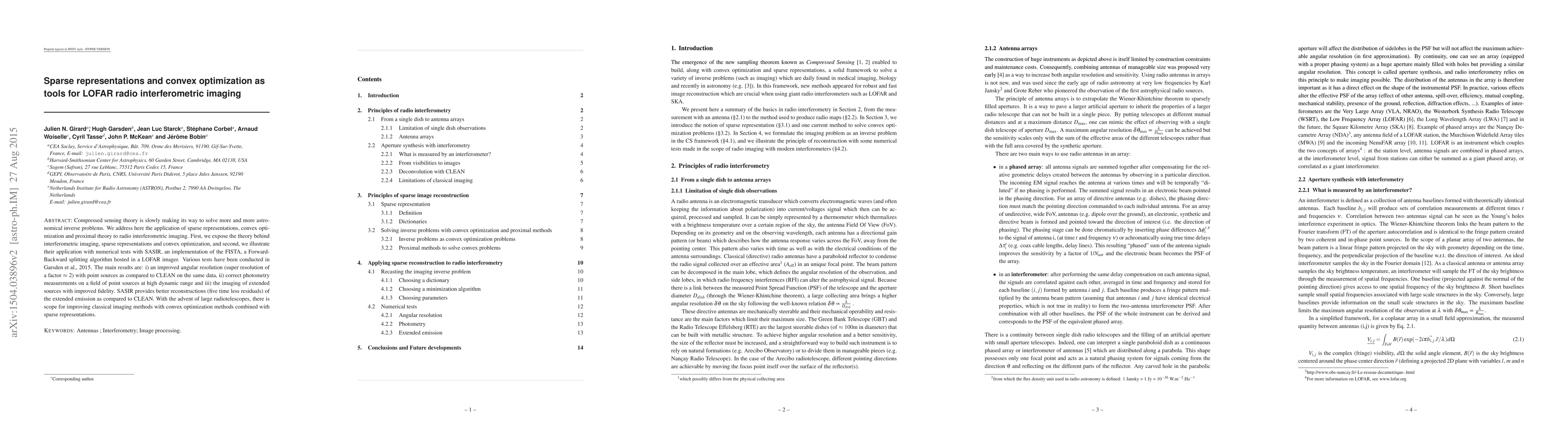 Compressed sensing theory is slowly making its way to solve more and more astronomical inverse problems. We address here the application of sparse representations, convex optimization and proximal theory to radio interferometric imaging. First, we expose the theory behind interferometric imaging, sparse representations and convex optimization, and second, we illustrate their application with numerical tests with SASIR, an implementation of the FISTA, a Forward-Backward splitting algorithm hosted in a LOFAR imager. Various tests have been conducted in Garsden et al., 2015. The main results are: i) an improved angular resolution (super resolution of a factor ~2) with point sources as compared to CLEAN on the same data, ii) correct photometry measurements on a field of point sources at high dynamic range and iii) the imaging of extended sources with improved fidelity. SASIR provides better reconstructions (five time less residuals) of the extended emission as compared to CLEAN. With the advent of large radiotelescopes, there is scope for improving classical imaging methods with convex optimization methods combined with sparse representations.