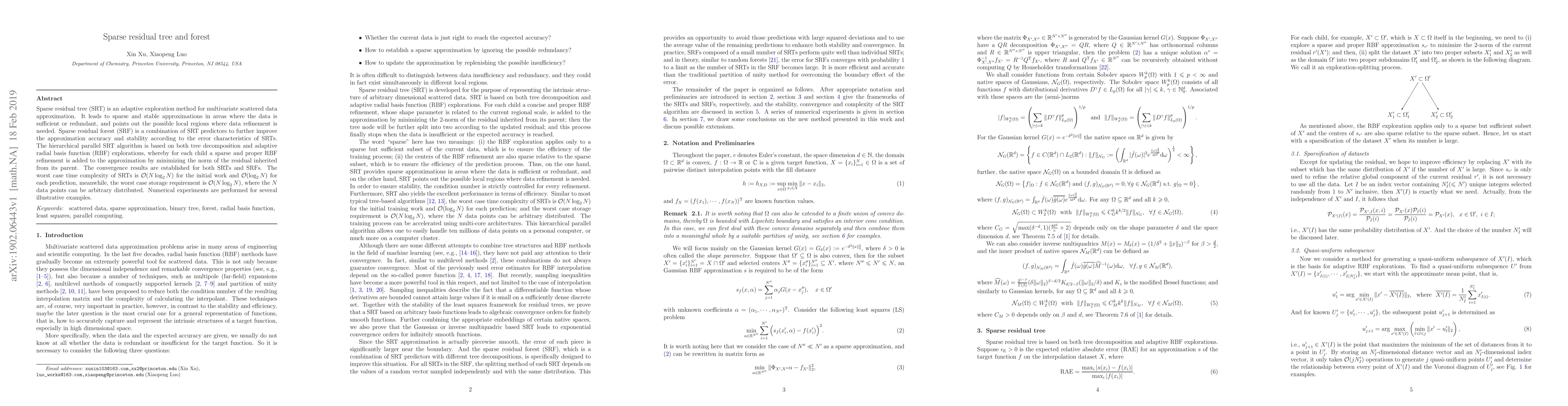 Sparse residual tree (SRT) is an adaptive exploration method for multivariate scattered data approximation. It leads to sparse and stable approximations in areas where the data is sufficient or redundant, and points out the possible local regions where data refinement is needed. Sparse residual forest (SRF) is a combination of SRT predictors to further improve the approximation accuracy and stability according to the error characteristics of SRTs. The hierarchical parallel SRT algorithm is based on both tree decomposition and adaptive radial basis function (RBF) explorations, whereby for each child a sparse and proper RBF refinement is added to the approximation by minimizing the norm of the residual inherited from its parent. The convergence results are established for both SRTs and SRFs. The worst case time complexity of SRTs is $\mathcal{O}(N\log_2N)$ for the initial work and $\mathcal{O}(\log_2N)$ for each prediction, meanwhile, the worst case storage requirement is $\mathcal{O}(N\log_2N)$, where the $N$ data points can be arbitrary distributed. Numerical experiments are performed for several illustrative examples.