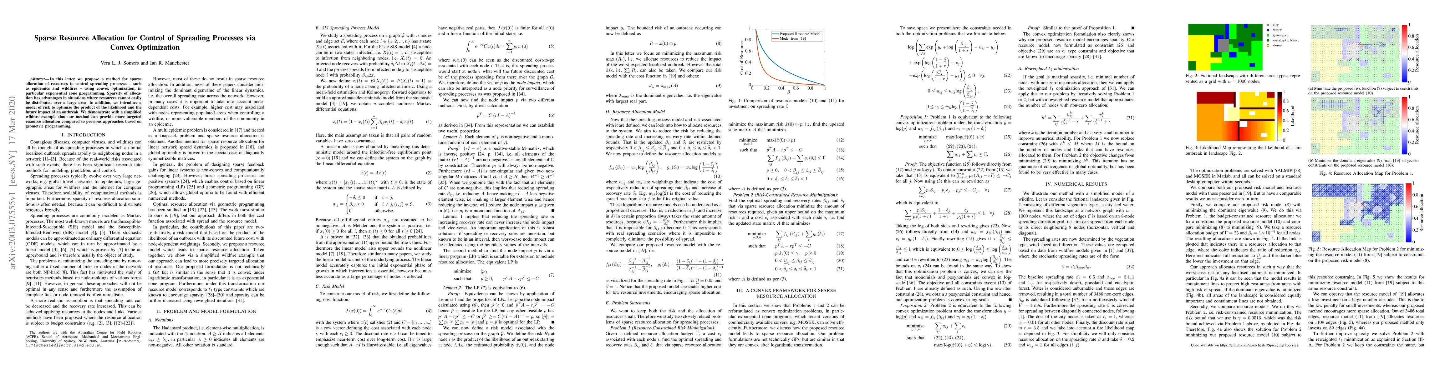 In this letter we propose a method for sparse allocation of resources to control spreading processes -- such as epidemics and wildfires -- using convex optimization, in particular exponential cone programming. Sparsity of allocation has advantages in situations where resources cannot easily be distributed over a large area. In addition, we introduce a model of risk to optimize the product of the likelihood and the future impact of an outbreak. We demonstrate with a simplified wildfire example that our method can provide more targeted resource allocation compared to previous approaches based on geometric programming.