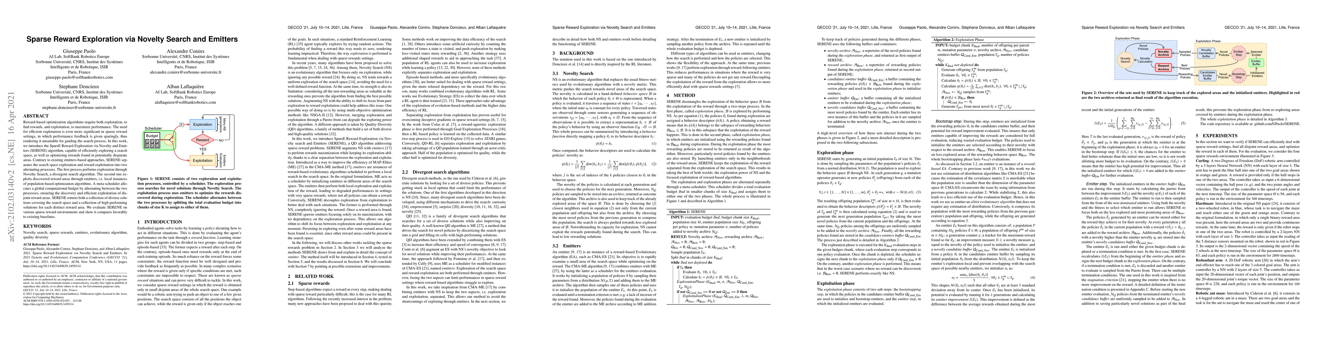 Reward-based optimization algorithms require both exploration, to find rewards, and exploitation, to maximize performance. The need for efficient exploration is even more significant in sparse reward settings, in which performance feedback is given sparingly, thus rendering it unsuitable for guiding the search process. In this work, we introduce the SparsE Reward Exploration via Novelty and Emitters (SERENE) algorithm, capable of efficiently exploring a search space, as well as optimizing rewards found in potentially disparate areas. Contrary to existing emitters-based approaches, SERENE separates the search space exploration and reward exploitation into two alternating processes. The first process performs exploration through Novelty Search, a divergent search algorithm. The second one exploits discovered reward areas through emitters, i.e. local instances of population-based optimization algorithms. A meta-scheduler allocates a global computational budget by alternating between the two processes, ensuring the discovery and efficient exploitation of disjoint reward areas. SERENE returns both a collection of diverse solutions covering the search space and a collection of high-performing solutions for each distinct reward area. We evaluate SERENE on various sparse reward environments and show it compares favorably to existing baselines.