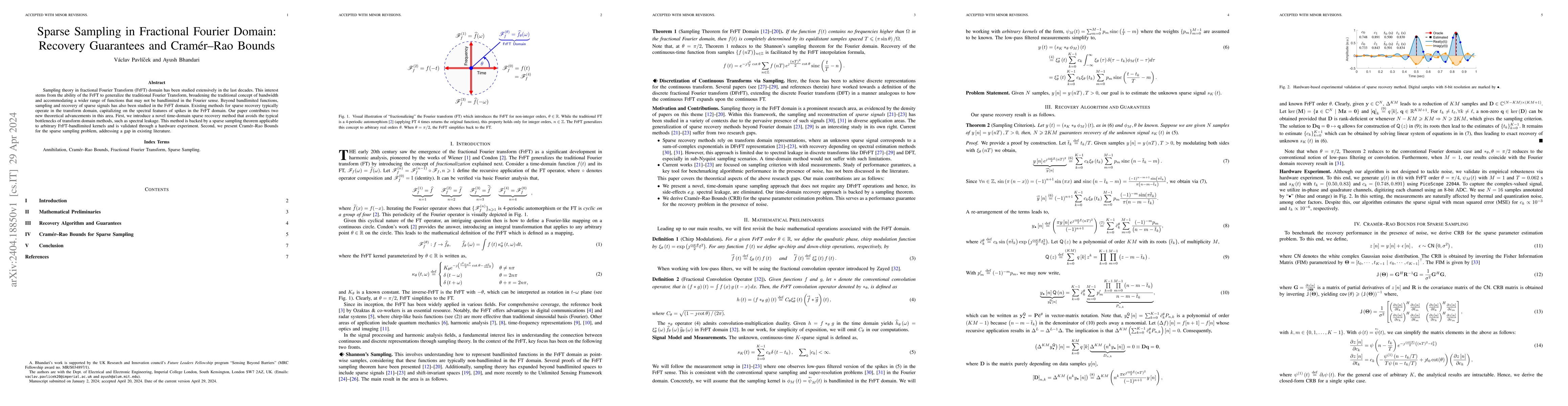 Sampling theory in fractional Fourier Transform (FrFT) domain has been studied extensively in the last decades. This interest stems from the ability of the FrFT to generalize the traditional Fourier Transform, broadening the traditional concept of bandwidth and accommodating a wider range of functions that may not be bandlimited in the Fourier sense. Beyond bandlimited functions, sampling and recovery of sparse signals has also been studied in the FrFT domain. Existing methods for sparse recovery typically operate in the transform domain, capitalizing on the spectral features of spikes in the FrFT domain. Our paper contributes two new theoretical advancements in this area. First, we introduce a novel time-domain sparse recovery method that avoids the typical bottlenecks of transform domain methods, such as spectral leakage. This method is backed by a sparse sampling theorem applicable to arbitrary FrFT-bandlimited kernels and is validated through a hardware experiment. Second, we present Cram\'er-Rao Bounds for the sparse sampling problem, addressing a gap in existing literature.