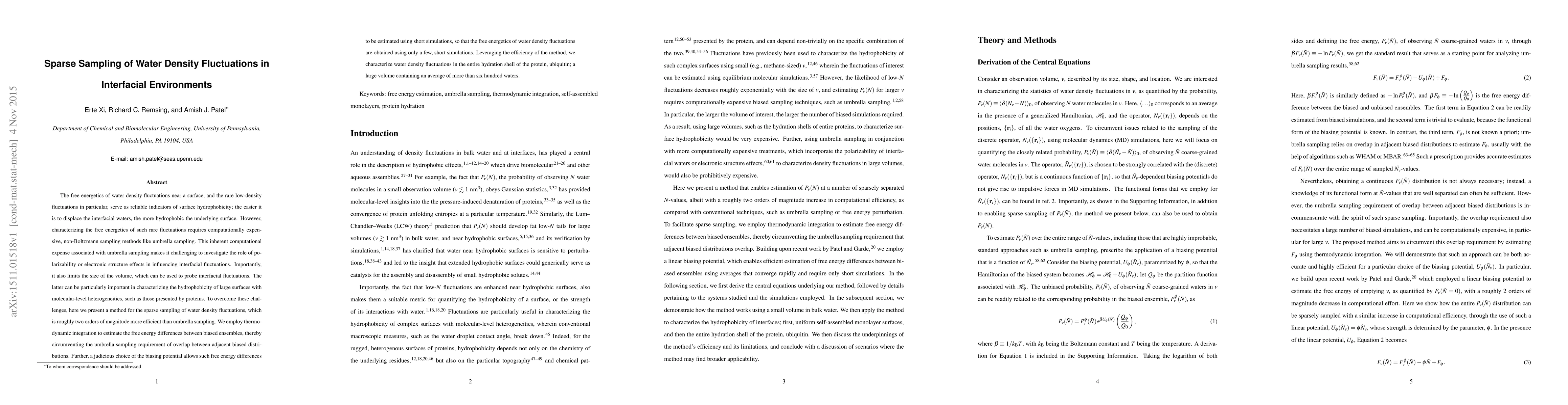 This paper introduces a significantly more efficient method for sparse sampling of water density fluctuations near surfaces, overcoming the computational expense of traditional umbrella sampling. The proposed method leverages thermodynamic integration and judicious biasing potentials to estimate free energy differences, enabling the characterization of water density fluctuations in large volumes, such as the hydration shell of proteins.