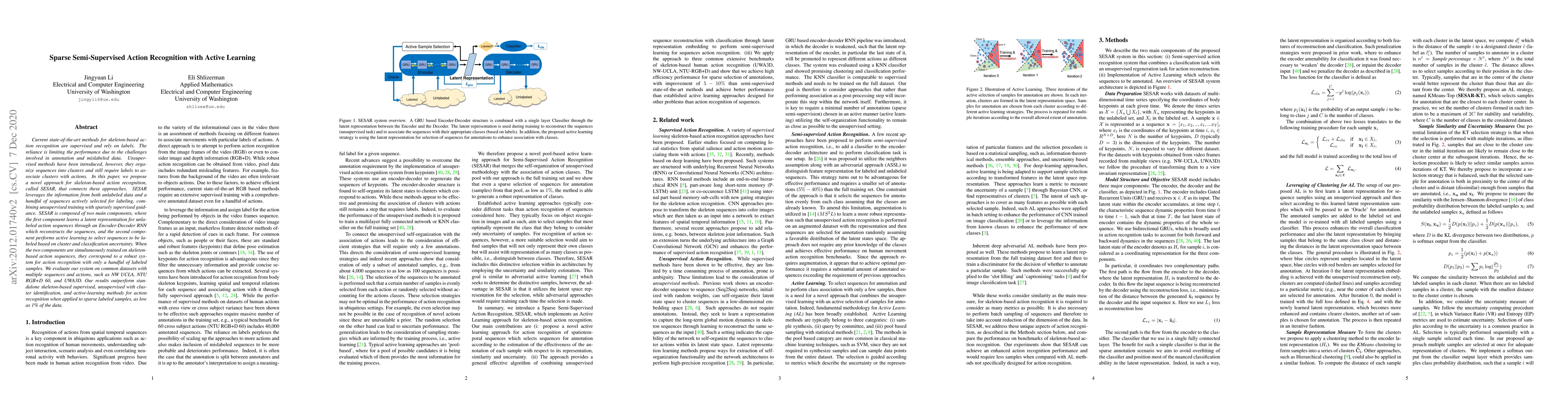 Current state-of-the-art methods for skeleton-based action recognition are supervised and rely on labels. The reliance is limiting the performance due to the challenges involved in annotation and mislabeled data. Unsupervised methods have been introduced, however, they organize sequences into clusters and still require labels to associate clusters with actions. In this paper, we propose a novel approach for skeleton-based action recognition, called SESAR, that connects these approaches. SESAR leverages the information from both unlabeled data and a handful of sequences actively selected for labeling, combining unsupervised training with sparsely supervised guidance. SESAR is composed of two main components, where the first component learns a latent representation for unlabeled action sequences through an Encoder-Decoder RNN which reconstructs the sequences, and the second component performs active learning to select sequences to be labeled based on cluster and classification uncertainty. When the two components are simultaneously trained on skeleton-based action sequences, they correspond to a robust system for action recognition with only a handful of labeled samples. We evaluate our system on common datasets with multiple sequences and actions, such as NW UCLA, NTU RGB+D 60, and UWA3D. Our results outperform standalone skeleton-based supervised, unsupervised with cluster identification, and active-learning methods for action recognition when applied to sparse labeled samples, as low as 1% of the data.